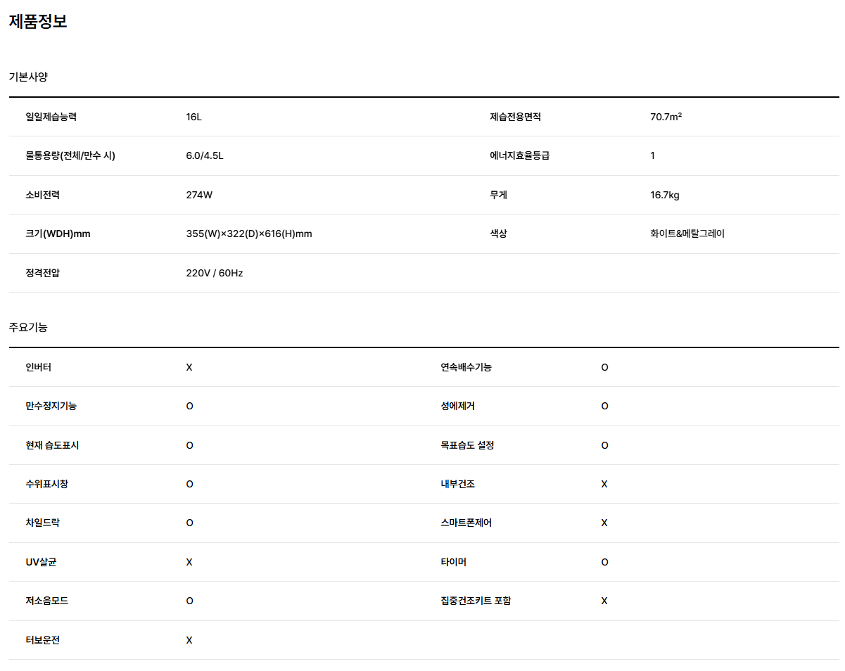 홈 에어컨/계절가전 공기청정기/제습기 제습기 리뷰 건 위닉스 16리터 1등급 제습기 DN2E160-KWK 상품번호 S6295678 사은품 1 / 1 할인가 304,000원 399,000원 최대혜택가 29% 282,920원 혜택 모두보기 배송비 무료배송 오후 2시 이전 주문건까지 당일출고 예정 도움말 당일출고 안내 상품에 따라 출고 예정일이 상이 할 수 있습니다. 특별쿠폰 [선착순] 위닉스 추가 할인 쿠폰받기 > 카드혜택 카드사별 무이자 혜택 > 팝업 닫기 재입고 알림을 신청 하시겠어요? 취소 재입고 알림 받기 팝업 닫기 재입고 알림이 신청 되었습니다. * 30일 후 자동 해제 * 마이랜드 재입고 알림 내역에서 확인 가능 확인 팝업 닫기 재입고 알림을 해제 하시겠어요? * 미입고시 2025-06-20 자동 해제 취소 지금 해제하기 팝업 닫기 재입고 알림이 해제 되었습니다. 확인 쿠폰받기 팝업 닫기 4% 할인 [선착순] 위닉스 추가 할인 발행 당월말까지 10원 이상 구매시 최대 100,000원 할인 쿠폰 받기 받기 완료 다운로드 받은 쿠폰은 마이랜드>쿠폰에서 확인가능합니다. 최소구매금액과 할인액을 확인하세요. 일부 쿠폰은 조기소진 될 수 있습니다. 쿠폰별 발급수량은 ID당 1개입니다. APP에서 구매하면 1% 추가 적립 본품 : 수량 감소 수량 증가 304,000원 총 상품금액 304,000원 생활파워케어 포함가 생활파손케어 포함가 선한청소 A옵션 포함가 구매하기 선물하기 장바구니 렌탈기간 렌탈료 월 원 제휴카드 렌탈료 도움말 제휴카드 렌탈료 LOCA X BS RENTAL 롯데카드 전월 30만원 이상 사용 ▶ 월 10,000원 할인 전월 70만원 이상 사용 ▶ 월 15,000원 할인 전월 150만원 이상 사용 ▶ 월 25,000원 할인 BS ON 플러스하나카드 전월 30만원 이상 사용 ▶ 월 13,000원 할인 전월 120만원 이상 사용 ▶ 월 23,000원 할인 ※ 결제 시 제휴카드 신규 발급도 가능하며, 발급이 완료되면 월렌탈료 할인이 가능합니다. 월 원 ※ 총 렌탈료에는 렌탈수수료가 포함되어 일반상품 가격과 차이가 있습니다. ※ 렌탈 시 전자랜드 쇼핑몰의 할인혜택(쿠폰,상품권,e.POINT 등) 및 카드혜택은 적용되지 않습니다. 렌탈하기 장바구니 팝업 닫기 렌탈 서비스 안내 왜 렌탈을 해야 하는거죠 ? 일반 구매 경우 결제 시 최대 6개월, 제휴카드 이용 시 최대 36개월 무이자 할부가 가능하지만 렌탈 구매 경우 일반카드/제휴카드 구분 없이 24,36,48,60개월 렌탈 가능. 추가로 일반 구매 시에 구매 금액 만큼 채무가 발생하게 되지만 렌탈은 당일 현장에서 결제되는 금액이 없이 약정기간 동안 월 렌탈료만 청구가 되므로 채무 발생이 없어 고객 개인 신용에도 영향 없이 구매가 가능합니다. 렌탈 계약 이후 해지가 가능한가요? 제품 설치(인도) 전에는 계약 해지가 가능합니다. (고객 접수하신 전자랜드 대리점에 문의) 설치 완료 후에는 해지 가능하나 위약금이 발생합니다. (위약금 :t잔여 렌탈료 100%) ※ 설치(인도) 완료 7일 이후 해지 문의는 렌탈사 고객센터(1588-6990)로 문의 주시면 됩니다. 렌탈 약정기간 종료 후 렌탈 제품의 소유권은 어떻게 되나요? 렌탈 약정기간 종료 시 렌탈료가 정상적으로 완납되었을 경우 렌탈 제품의 소유권은 계약자에게 이전됩니다. 완납정보는 렌탈사 BS ON 을 통해 알 수 있습니다. 법인명, 법인사업자 카드로 렌탈페이 진행이 가능한가요? 개인명의, 개인카드로만 렌탈 접수 가능합니다. 본인명의의 휴대폰으로만 렌탈 신청 가능한가요? 네. 신청자 본인명의의 휴대폰번호로 신청 가능하며, 본인명의의 카드로 신청 가능합니다.(스마트폰 으로만 신청 가능) 렌탈을 하게 되면 신용에 문제가 생기지 않나요? 렌탈사는 고객의 렌탈 가능 여부를 위해 조회만을 하기 때문에 고객의 신용에 영향을 주지 않습니다. 제휴카드 할인은 어떻게 받을 수 있나요? 이미 렌탈사 제휴카드(롯데카드,하나카드,우리카드)를 소지하신 경우, 렌탈 결제정보 입력 시 해당 카드 정보를 입력하시면 할인이 가능하며, 제휴카드가 없으신 경우 렌탈 결제정보 입력 시 제휴카드 신규 발급을 요청하시면 발급 완료 후 할인이 가능합니다. 렌탈료 자동납부 신청방법 렌탈사 고객센터(1588-6990)를 통해 제휴카드로 자동납부 신청 바랍니다.각 카드사에 렌탈료가 청구되는 시점부터 할인 혜택이 적용됩니다. 렌탈 제품 주문 후 취소 또는 교환/반품을 하면 어떻게 되나요? 취소 : 제품이 배송되기 전 취소 시 주말/공휴일을 제외하고,1~3일 내에 취소 완료 처리됩니다. 교환/반품 : 제품이 배송/설치된 경우 교환 및 반품은 불가합니다. 단, 제품에 하자가 있는 경우 확인 후 교환 및 반품이 가능합니다. 할인 · 혜택 모두보기 팝업 닫기 정상가 399,000원 즉시할인 79,000원 쿠폰할인 5% 할인 쿠폰 16,000원 할인가 304,000원 e.POINT 최대적립 i 창닫기 최대 적립 포인트는 할인가 기준으로 계산되며, 최종결제금액과 결제 조건에 따라 적립금액이 변경됩니다. 주문서에서 최종 적립혜택을 다시 한번 확인해주세요. 6,080P 기본적립 3,040P 앱 구매시 추가적립 추천 3,040P 카드혜택 하나카드 즉시할인(일반결제) 15,000원 최대 혜택가 282,920원 하나카드 즉시할인 유의사항 (ID별 최초 1회) ※ 본 혜택은 이벤트 기간 내 ID당 1회만 적용 가능합니다.- 이벤트 기간 : 4/1~4/30일 * 예산조기