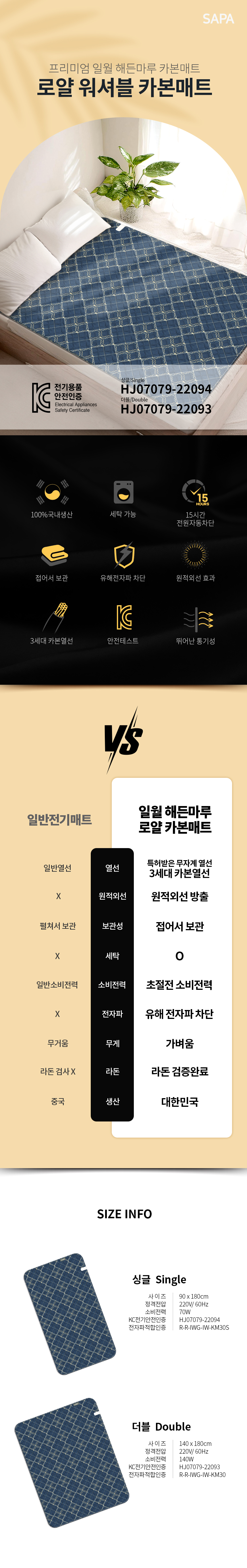 일월 해든마루 카본매트 로얄 90x180 워셔블 전기매트 싱글