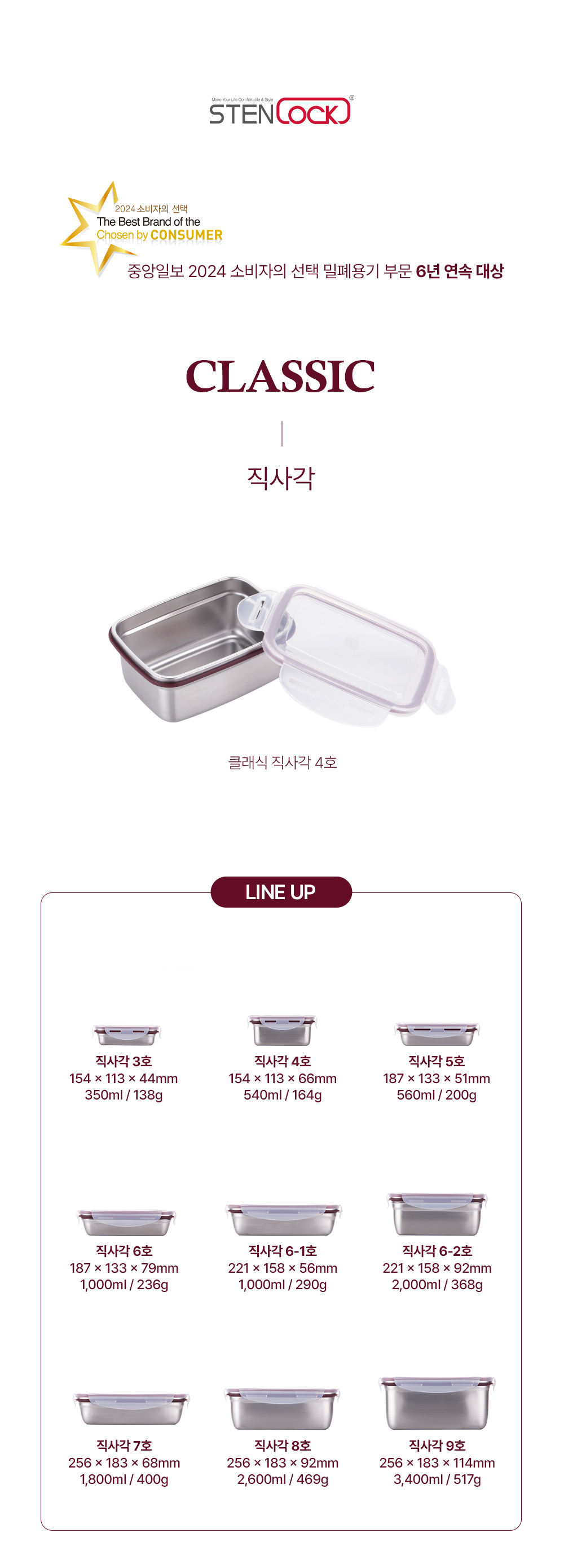 스텐락 국산 스텐밀폐용기 클래식 직사각 4호 540ml