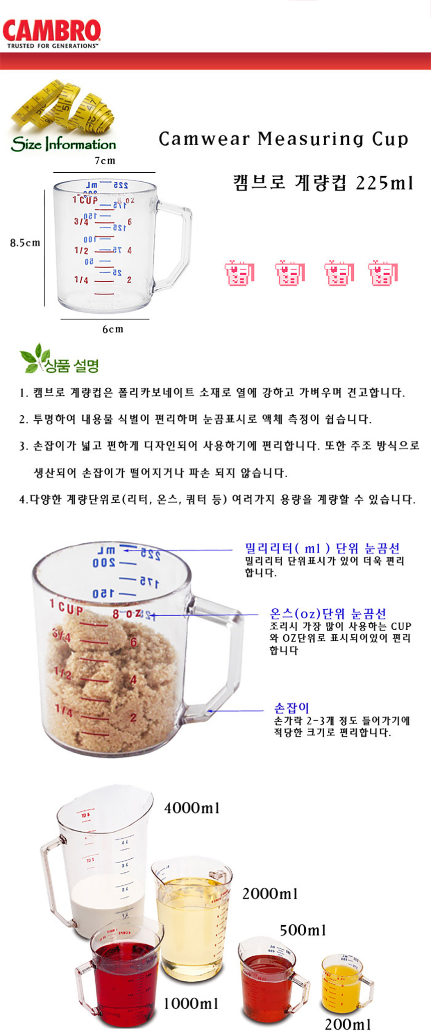 Cambro 캠브로 PC 계량컵 225ml 플라스틱 베이킹 이유식 비커