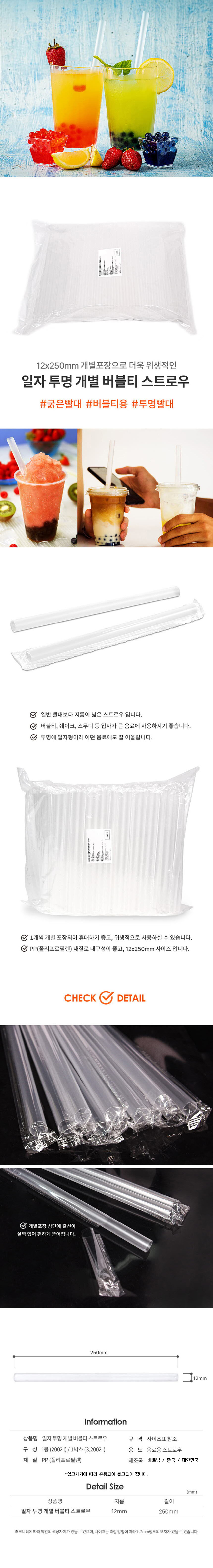 테이크아웃 버블티 스트로우 개별포장 빨대 25cm 투명 200개