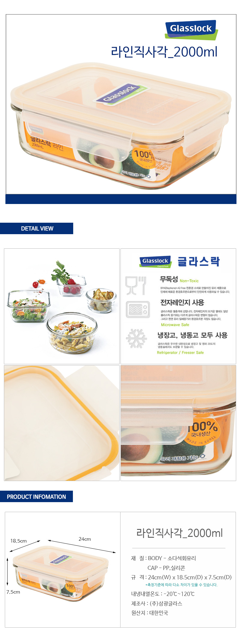 상품명:글라스락 라인 밀폐용기 2000ml 직사각 반찬통 샐러드