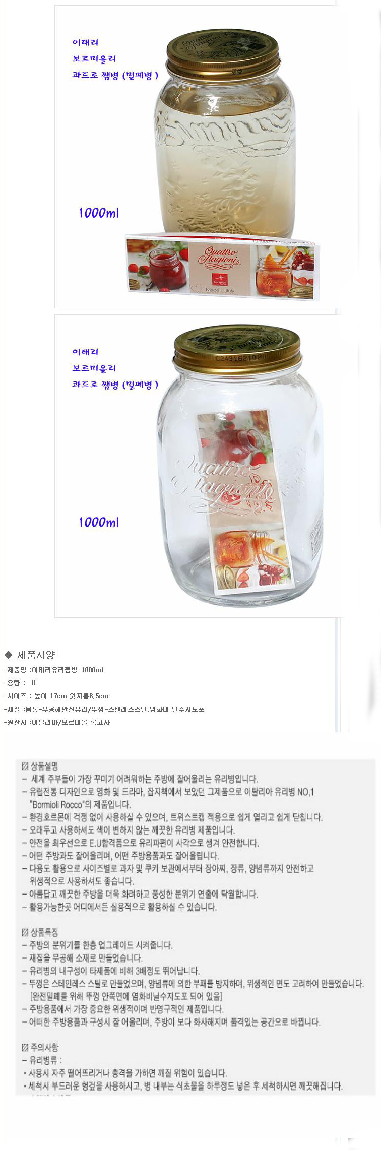 상품명:보르미올리 밀폐병 1L 소스 양념 캔들 보관 공병 용기