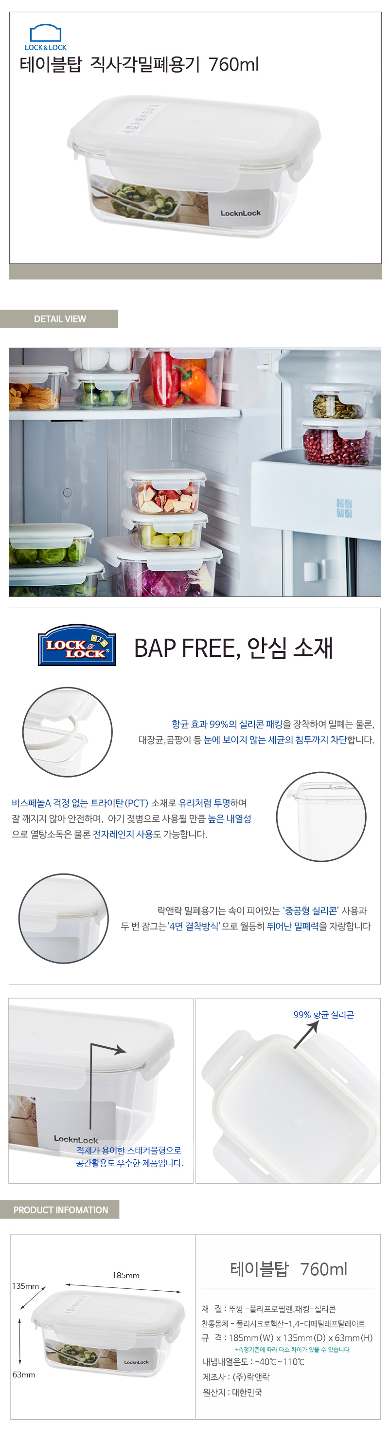 상품명:락앤락 테이블탑 밀폐용기 760ml 직사각 내열 반찬통