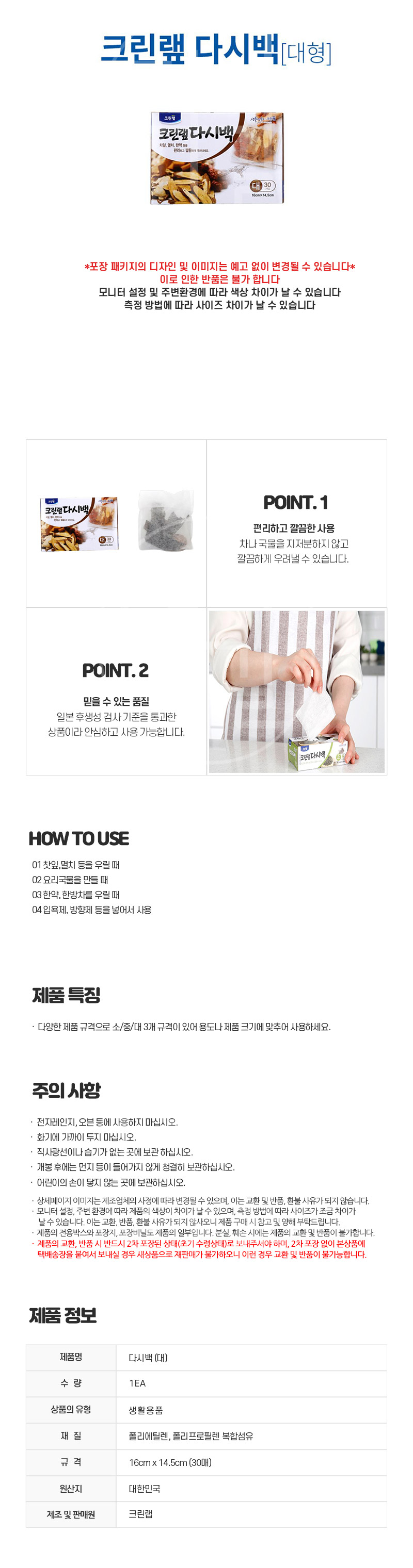상품명:크린랩 다시백 대 30P 육수 거름망 멸치 채수 다시통