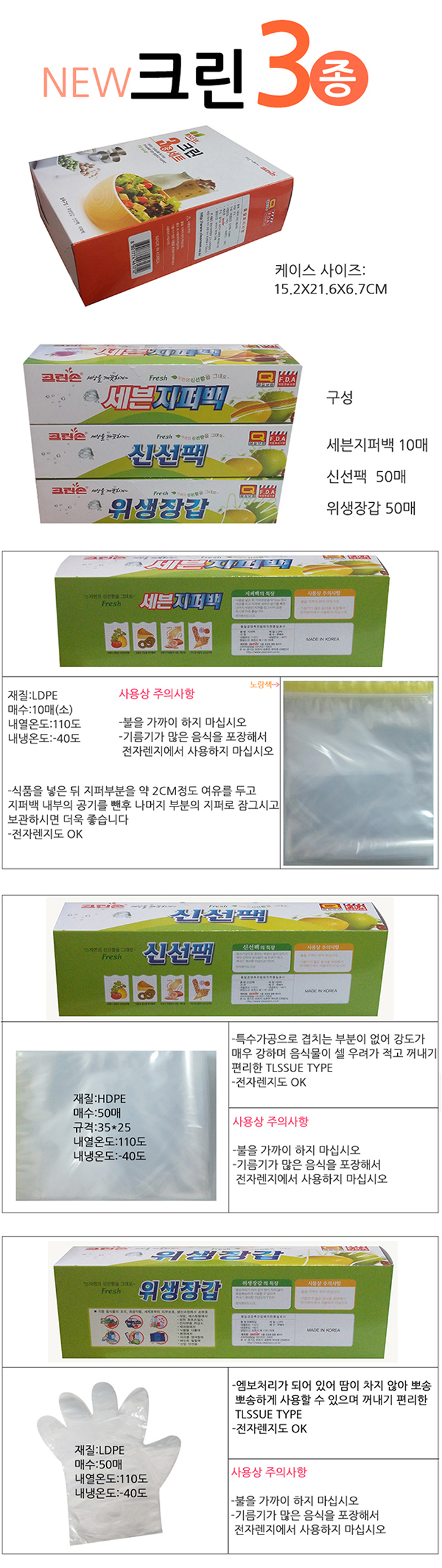 상품명:크린손 뉴크린3종세트 지퍼백팩장갑