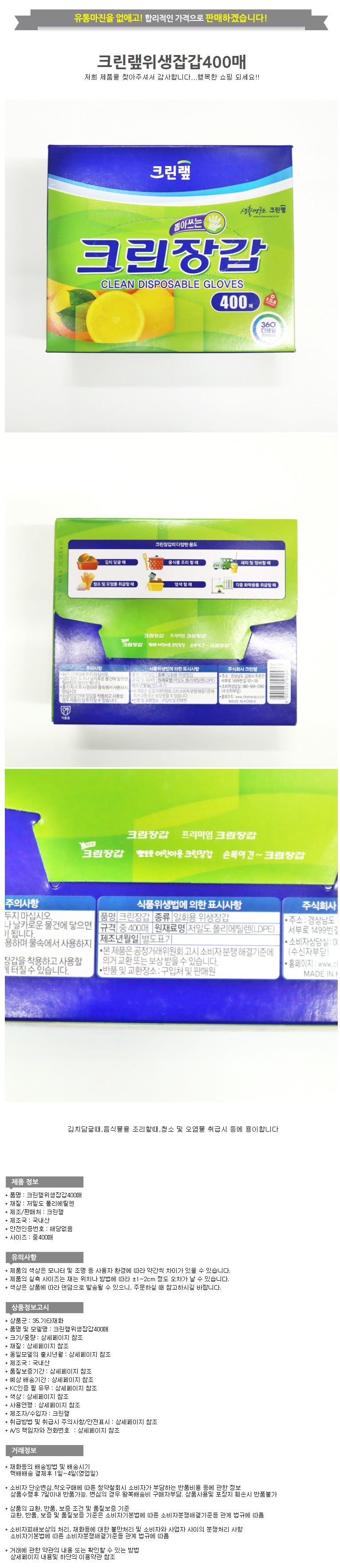 상품명:크린랲 위생잡갑 400매 업소용위생장갑 식품용위생장