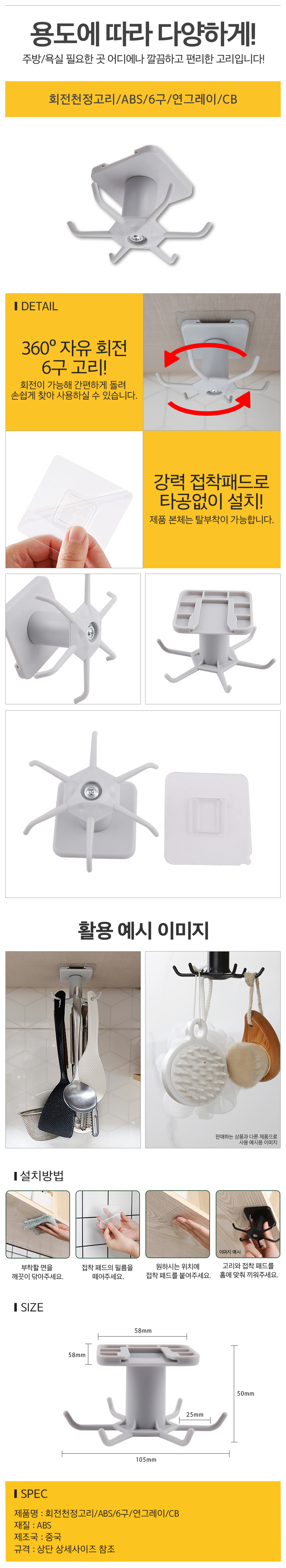 상품명:천정고리 회전형(6구) 연그레이 욕실 주방 소품걸이