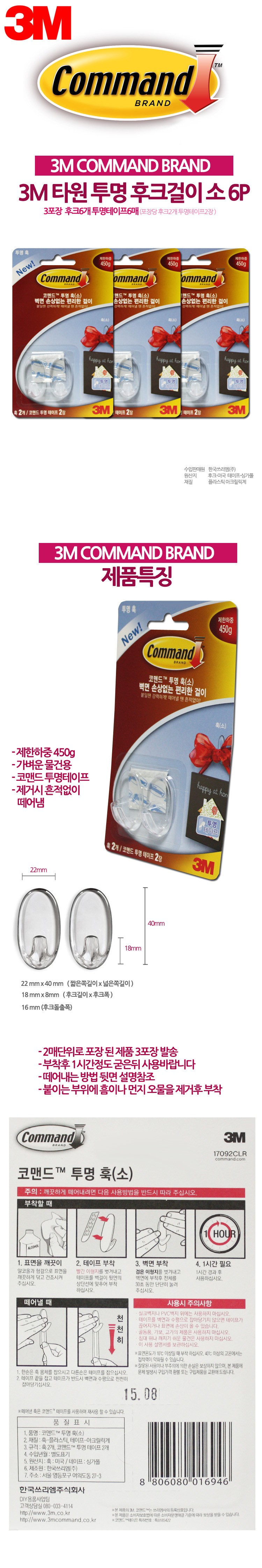 상품명:3M 무타공 주방 소품 걸이 투명 후크 행거 6P 욕실 옷