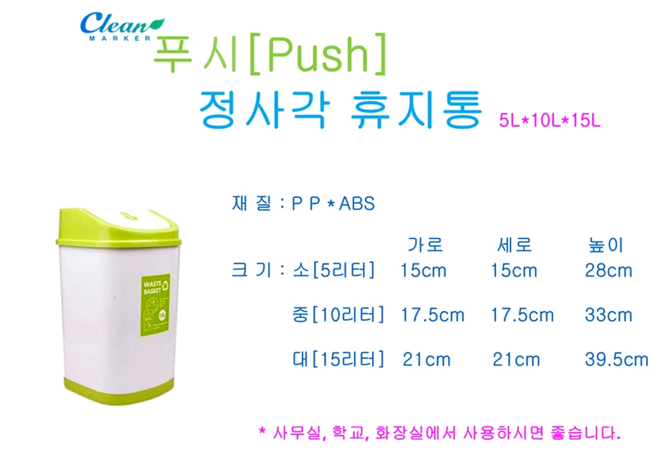 푸시 사각 플라스틱 휴지통 5L 쓰레기통