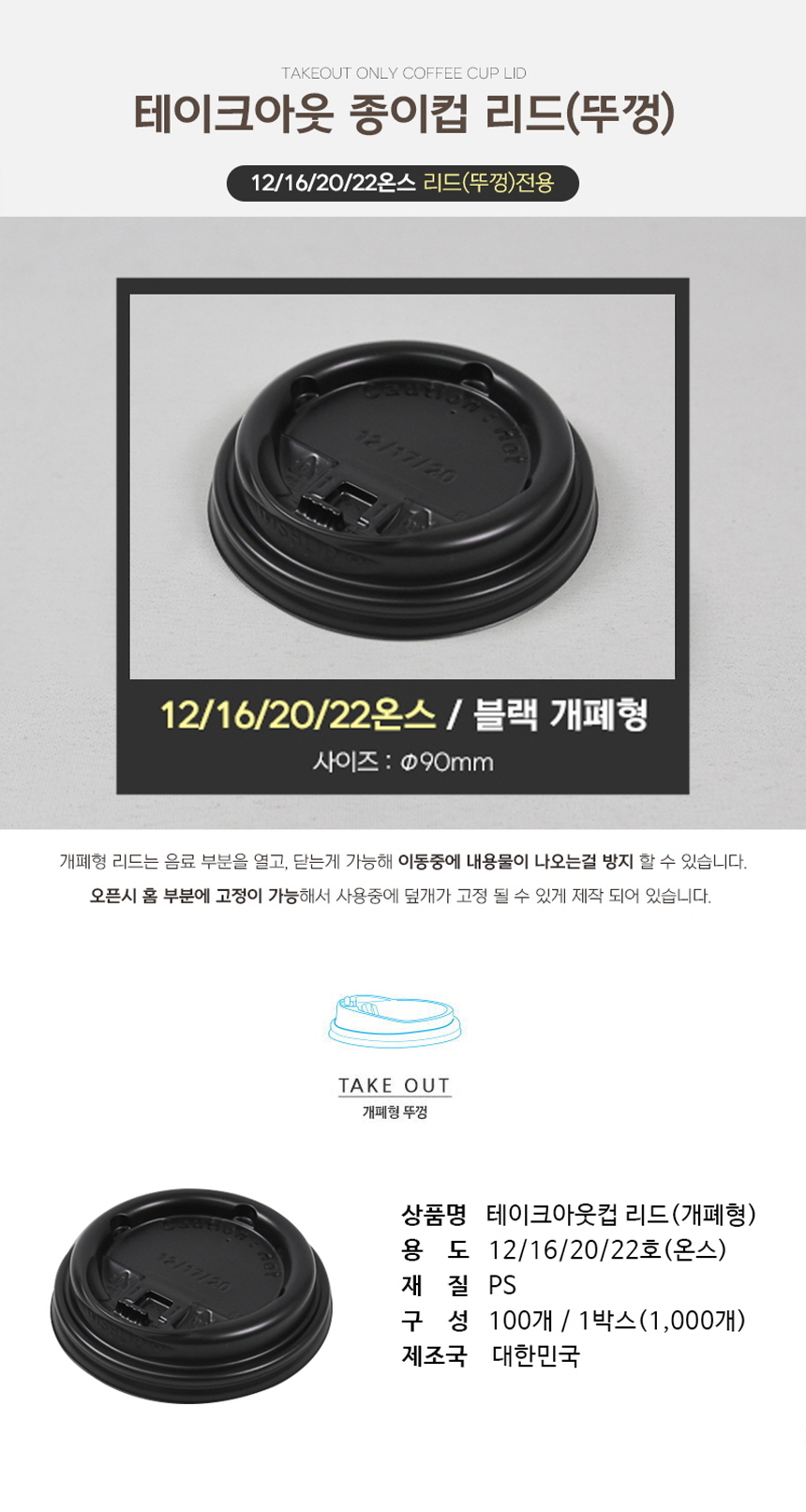 테이크아웃 12,16,20,22온스 개폐형 종이컵 뚜껑 블랙 100개