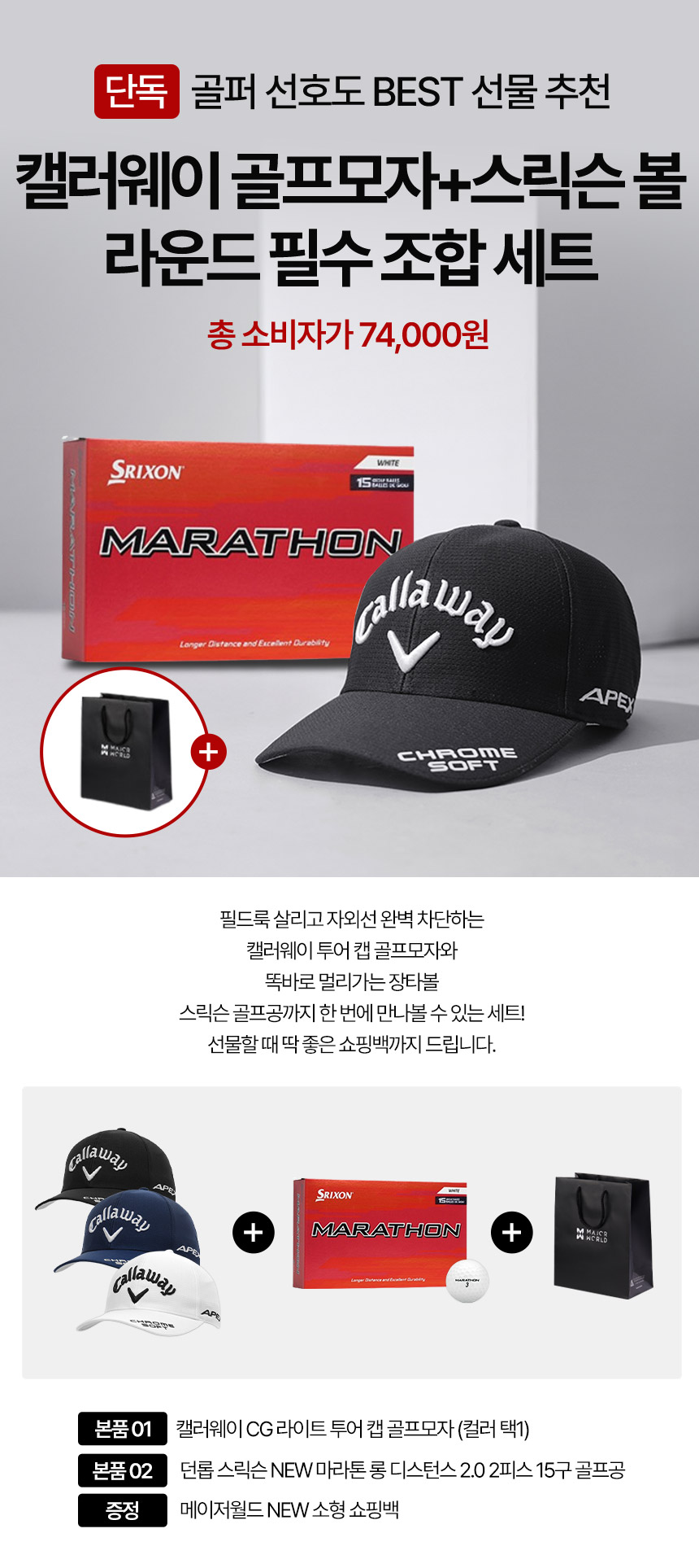 캘러웨이 CG 라이트 투어 캡 골프모자 + 마라톤 롱 디스턴스 2.0 15구 골프공 + 쇼핑백 선물세트