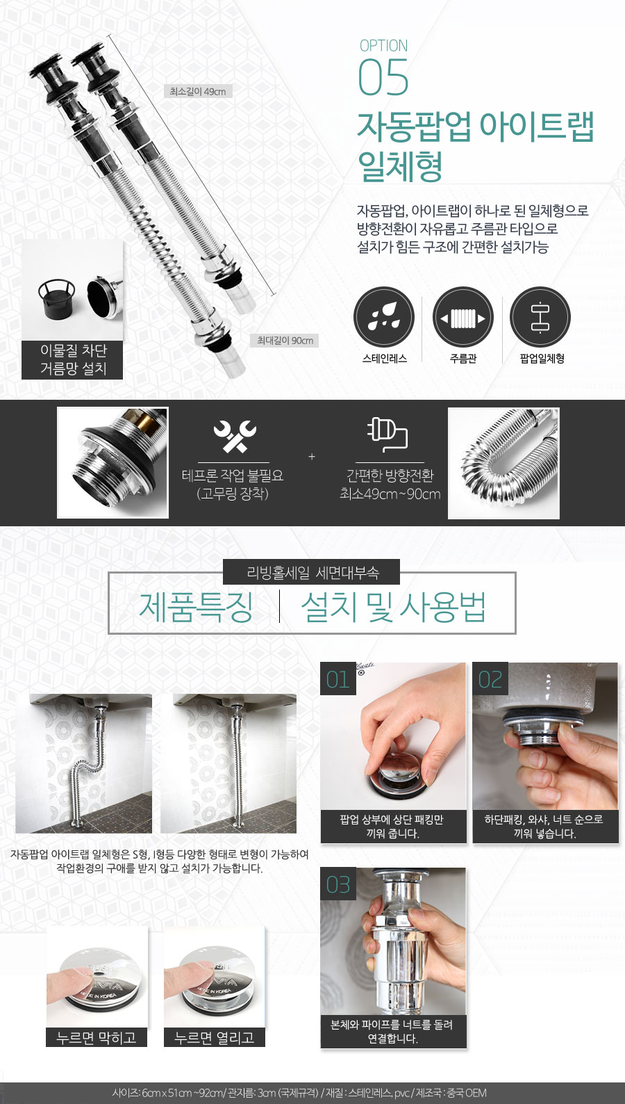 상품명:세면대 배수관 트랩 하수관 교체 자동팝업아이트랩일