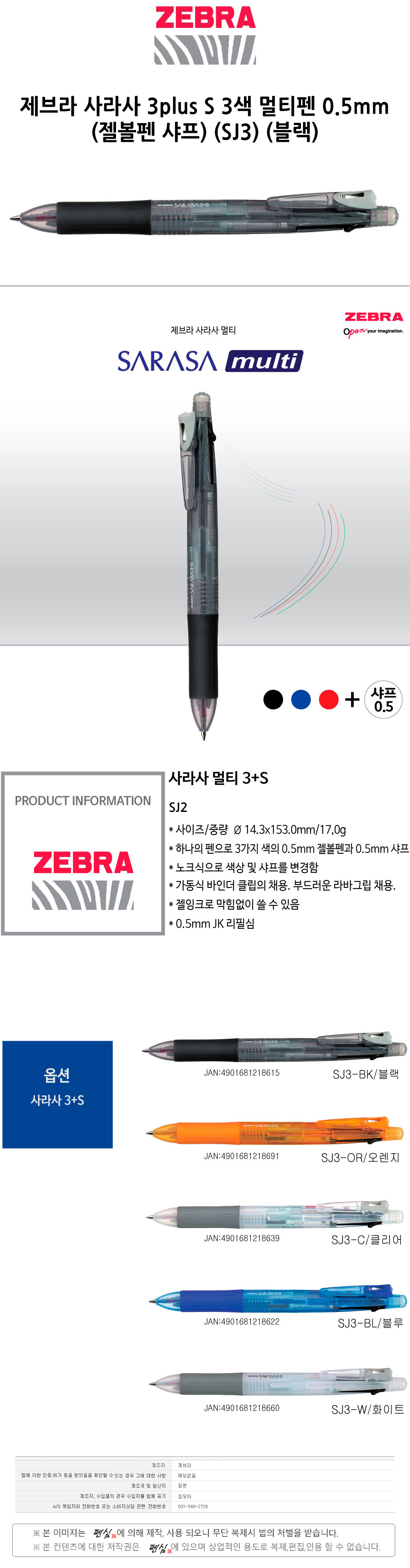 상품명:제브라 3plus S 3색 SJ3 블랙 멀티펜 사라사 0.5 샤프