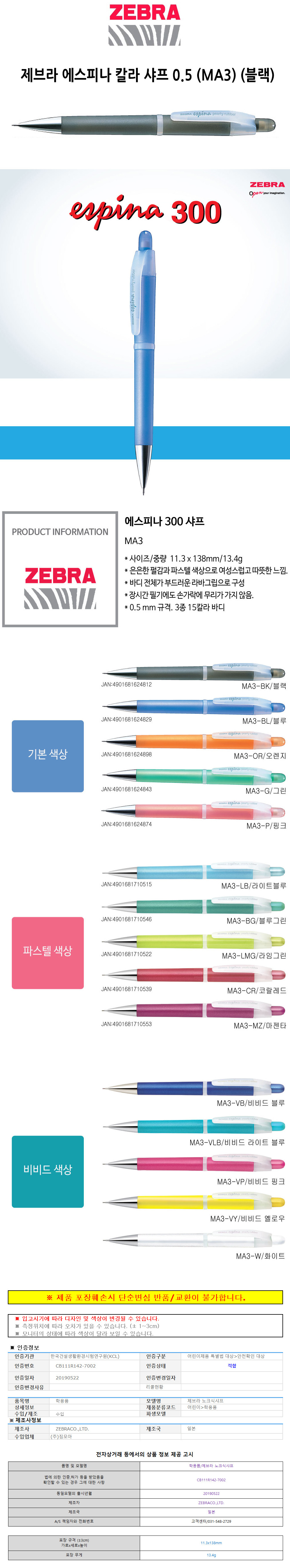 상품명:제브라 에스피나 칼라 샤프 0.5 MA3 블랙