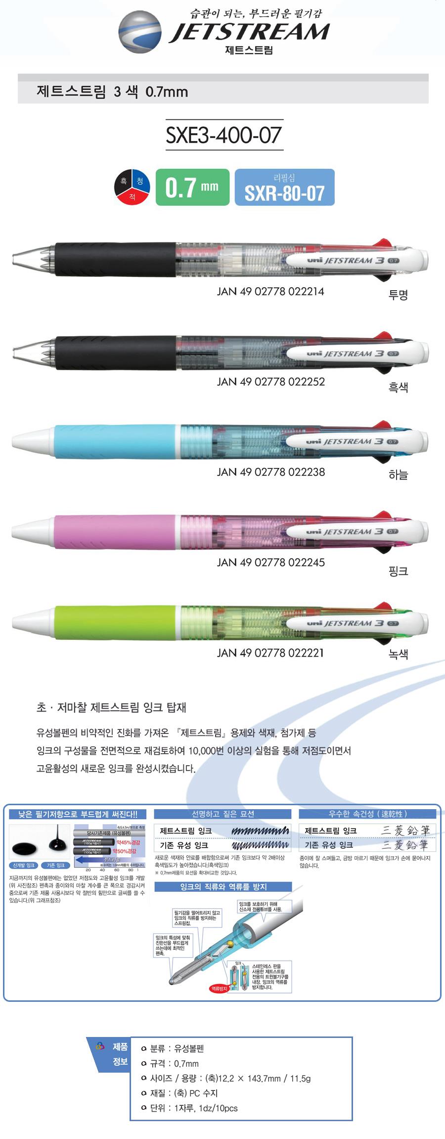 볼펜 흑색 0.7mm 3색 필기감 유성 잉크