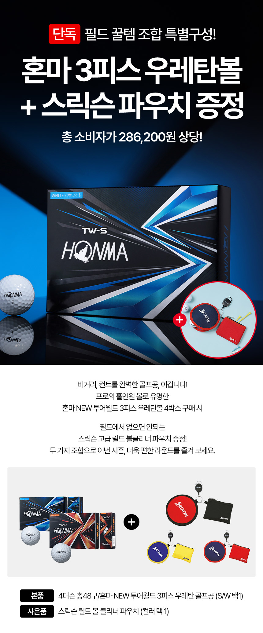 4박스 총48구/혼마 NEW 투어월드 3피스 골프공 우레탄 비거리 소프트 골프볼+스릭슨 볼클리너 파우치