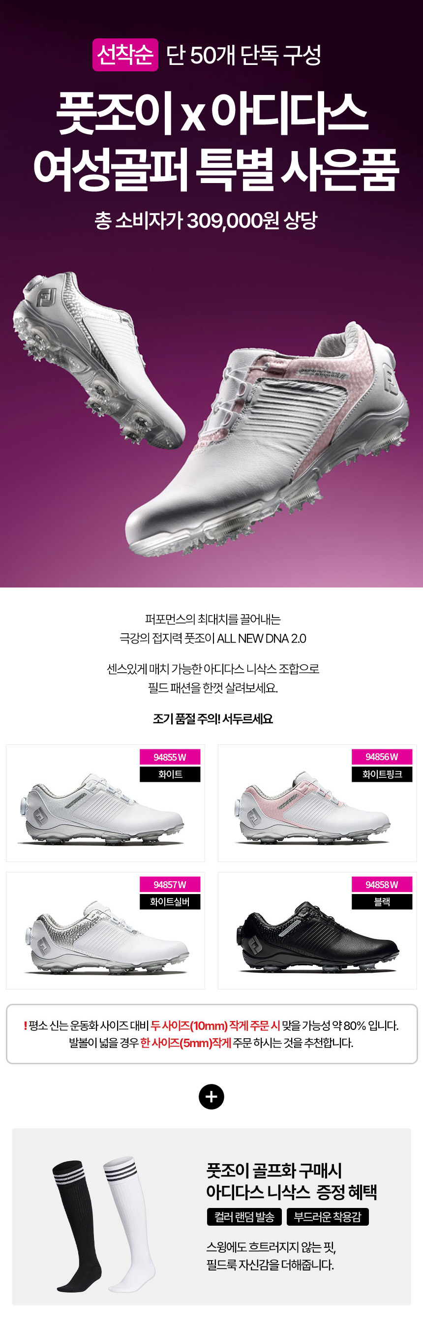 풋조이 우먼스 ALL NEW DNA 2.0 헬릭스 보아 여성 골프화 + 아디다스 니삭스