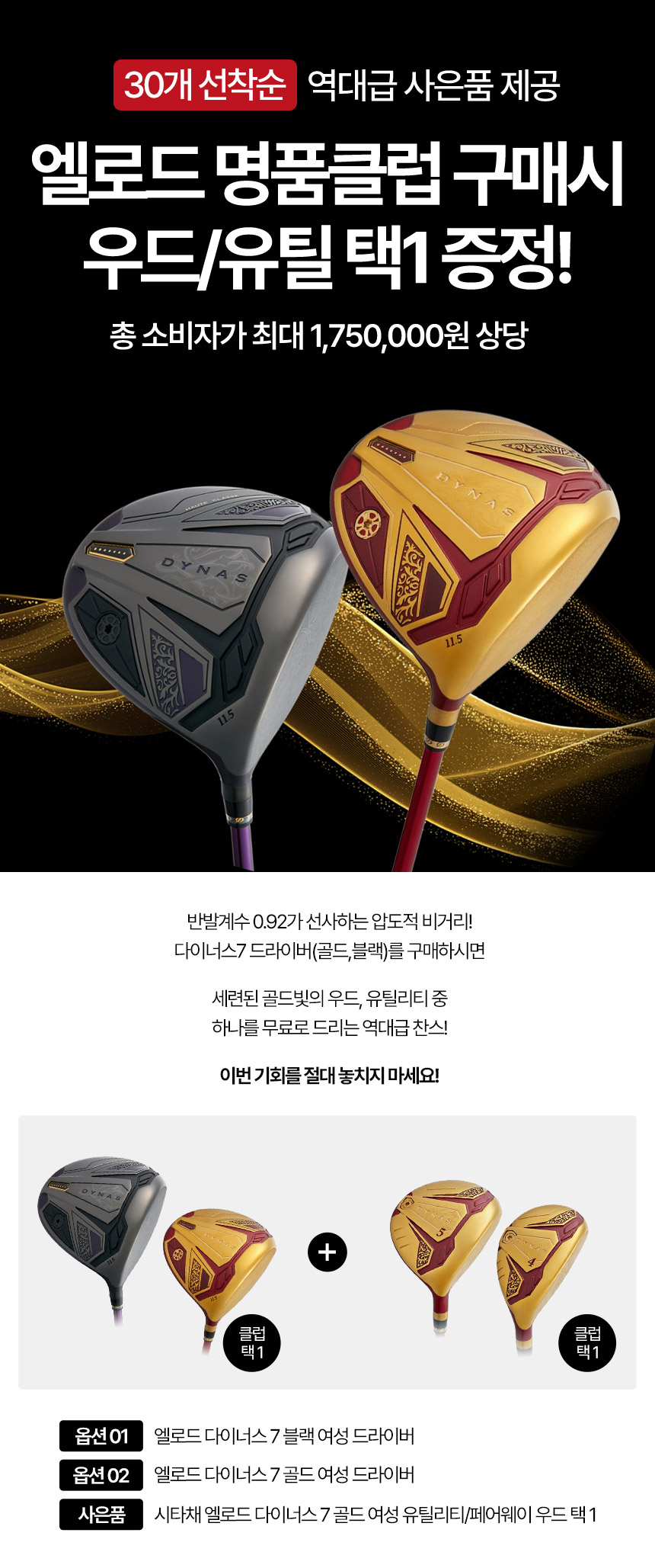 엘로드 다이너스 7 골드 / 블랙 여성 드라이버 + 시타채 다이너스 7 유틸 / 우드 증정 택1