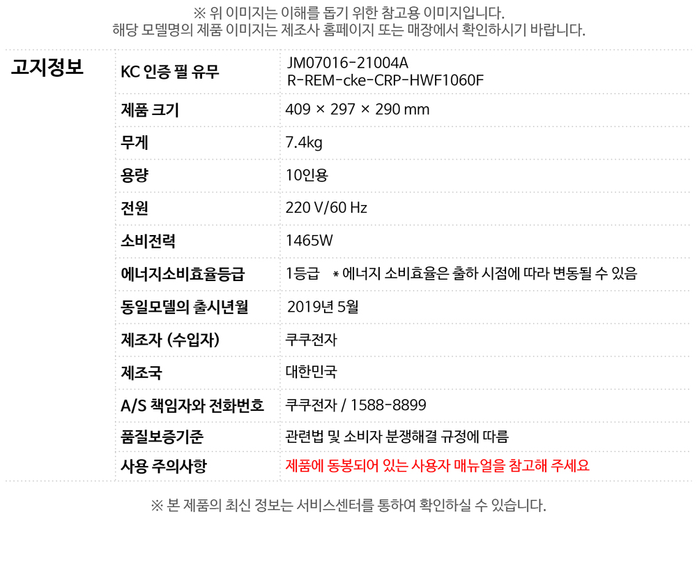 KC 인증정보 kcicon JM07016-21004A / R-REM-cke-CRP-HWF1060F