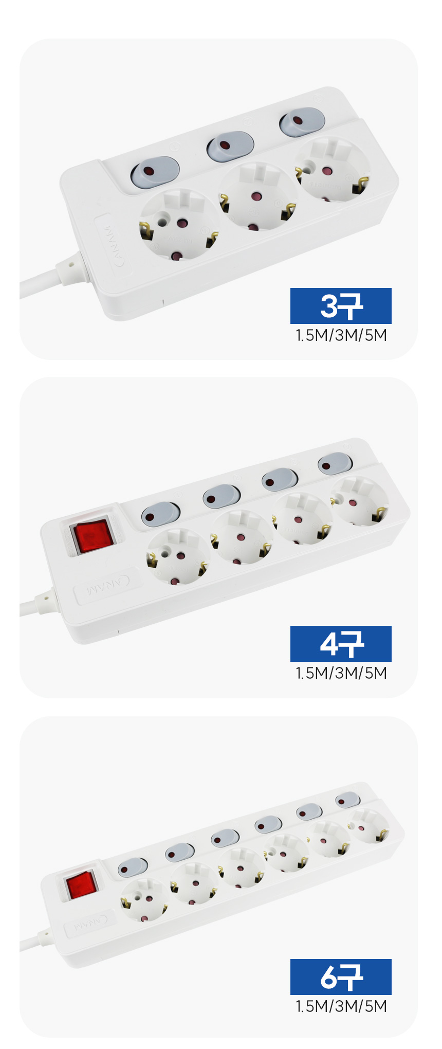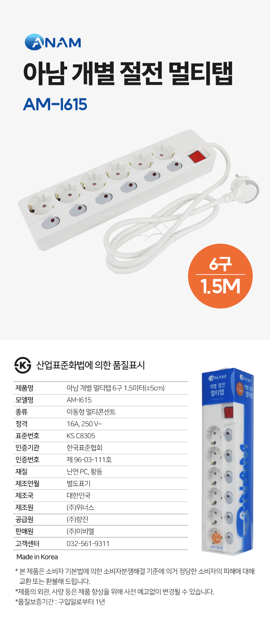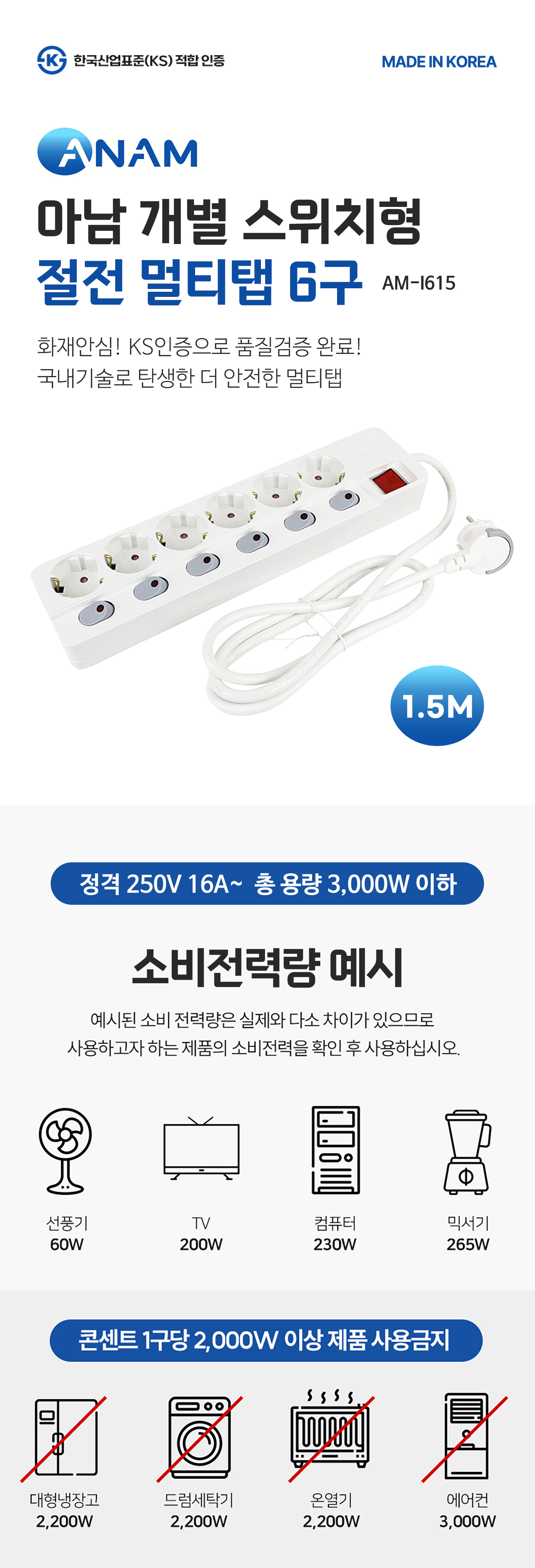 [캠플러스] 아남 국산 멀티탭 6구 1.5M 개별 스위치 절전 안전 콘센트