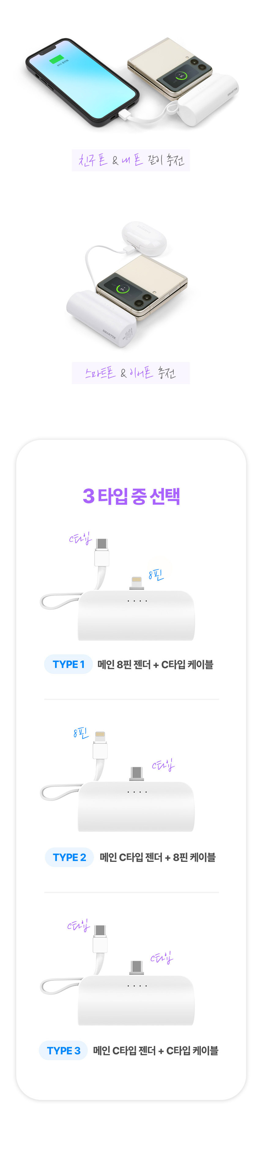 스마텍 5000mAh 2WAY 듀얼 일체형 미니 보조배터리(8핀/C타입) STPB-MB50