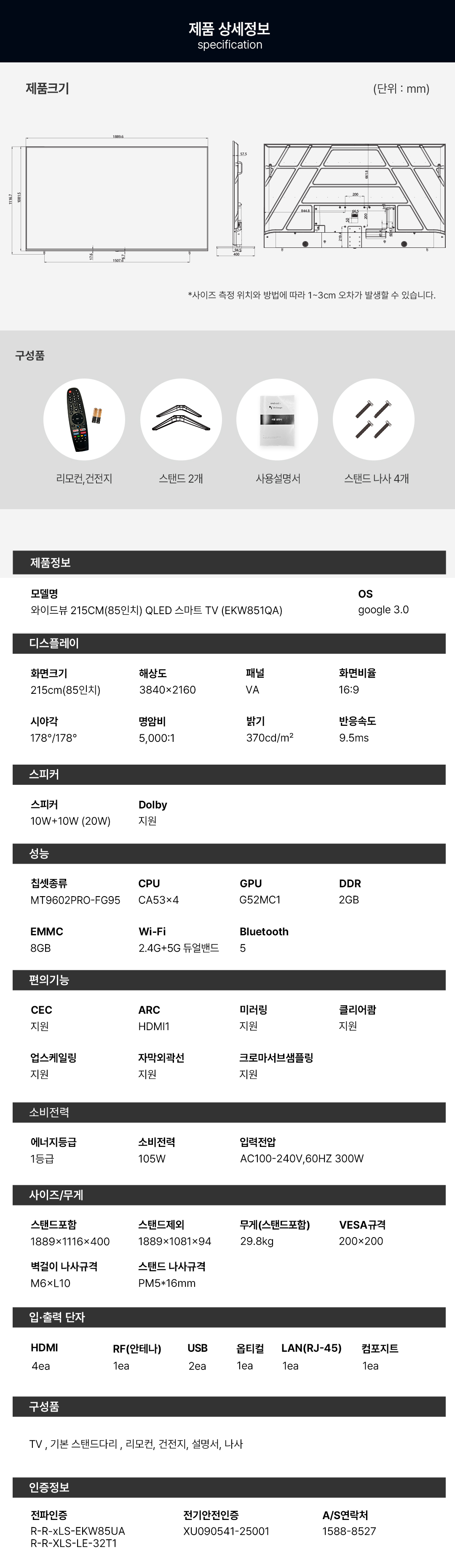 와이드뷰 구글 스마트 QLED 215cm(85인치) UHD 4K TV EKW851QA 기사방문 스탠드설치 무료