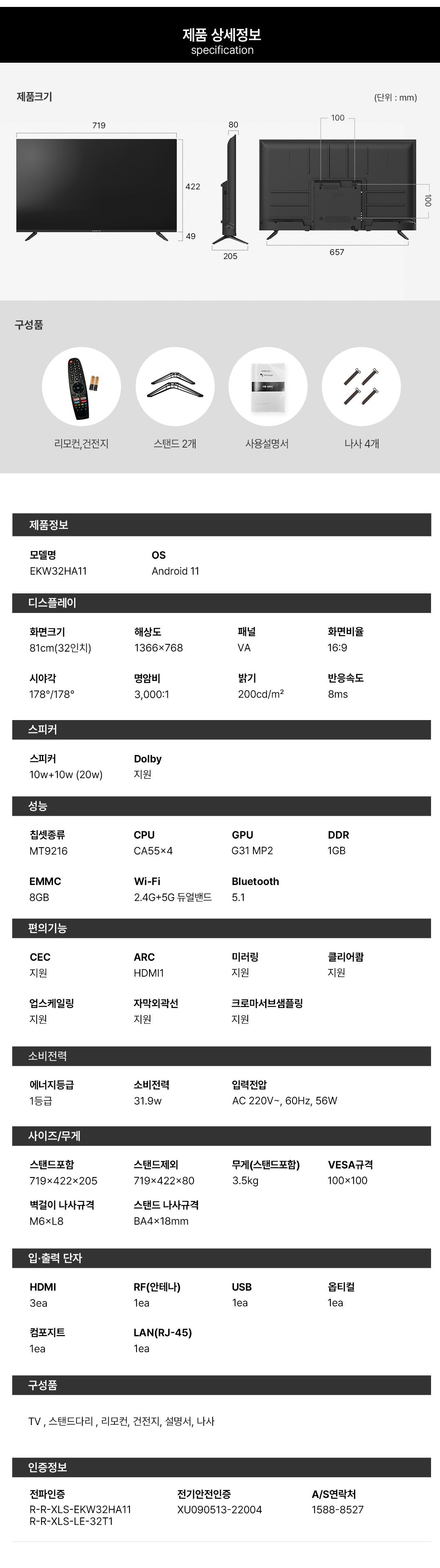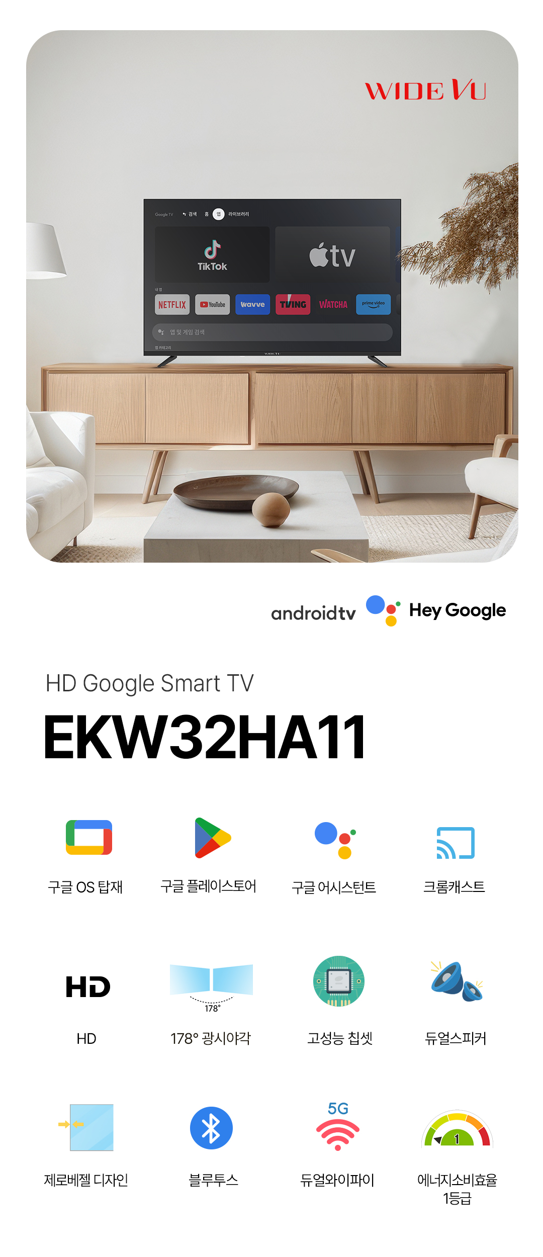 와이드뷰 81cm(32인치) 안드로이드 스마트 HD TV 구글인증 EKW32HA11