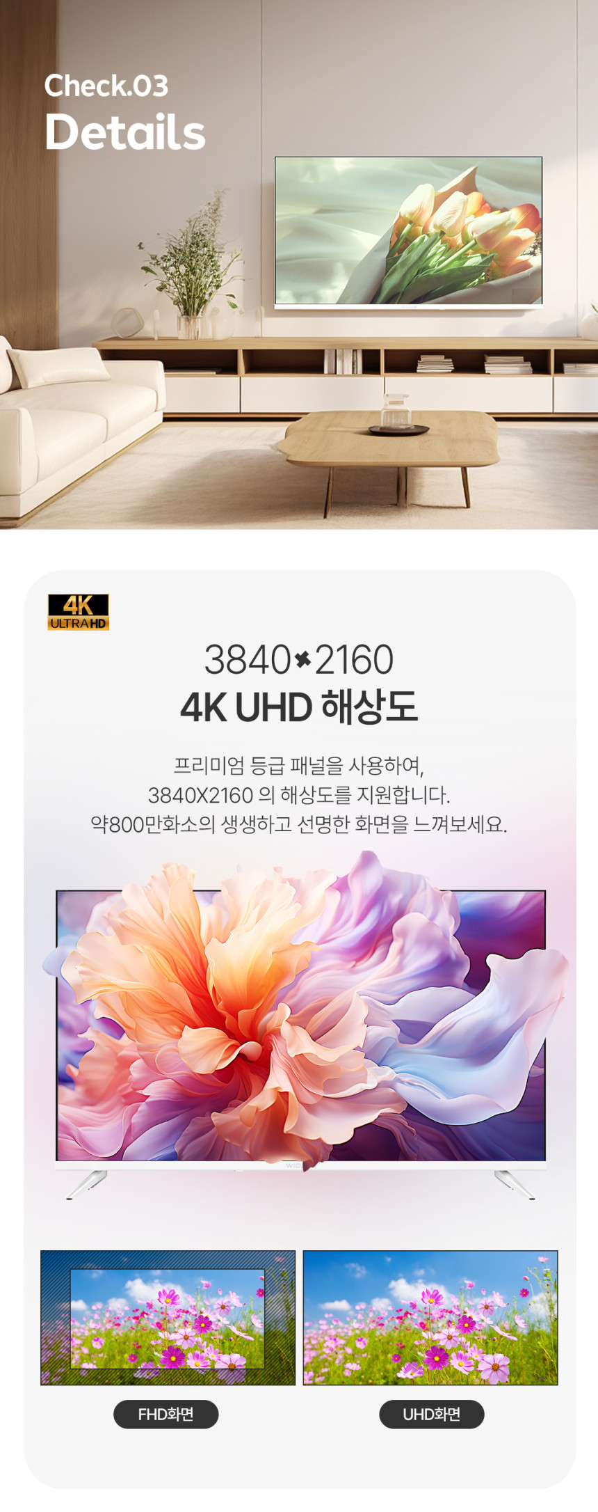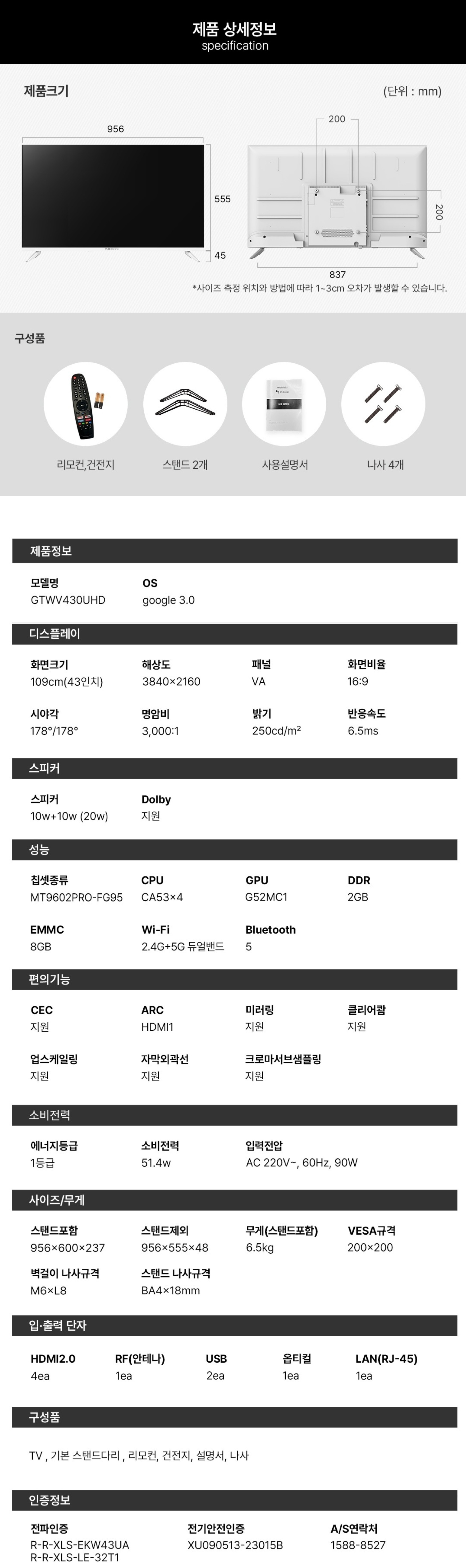 와이드뷰 109cm(43인치) UHD 4K TV 화이트색상 구글 스마트 티비 GTWV430UHD 단품