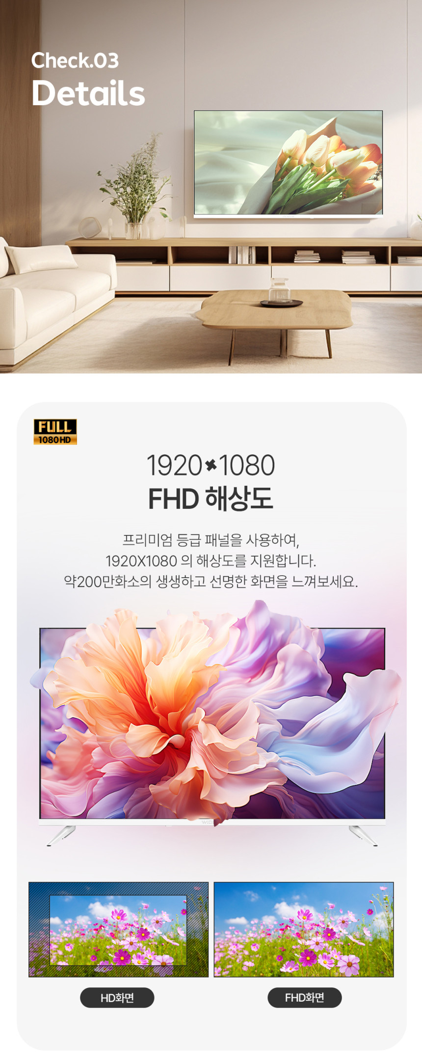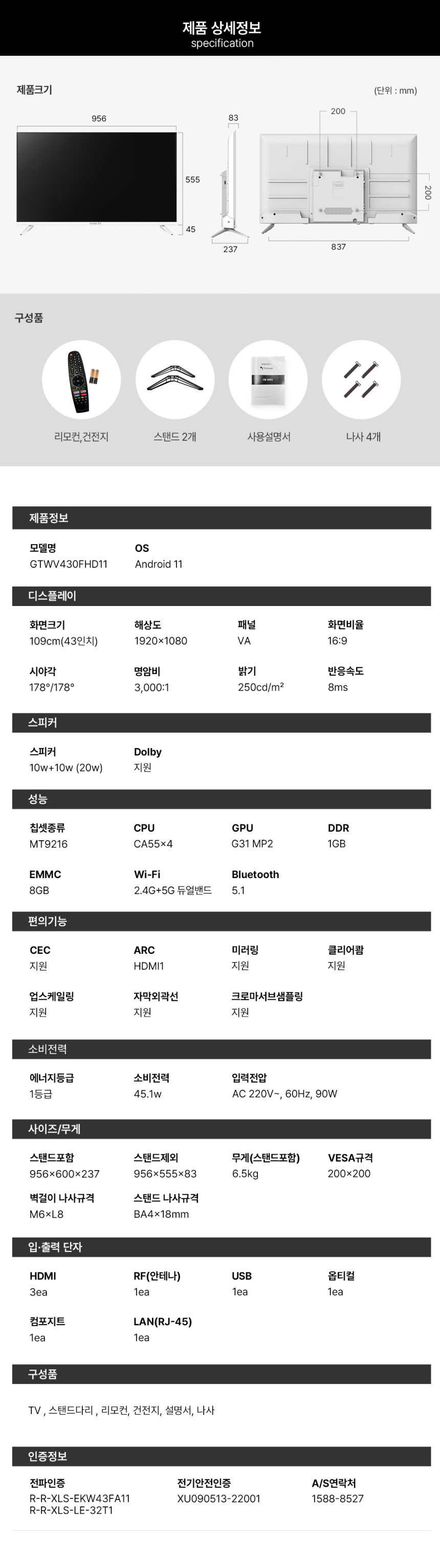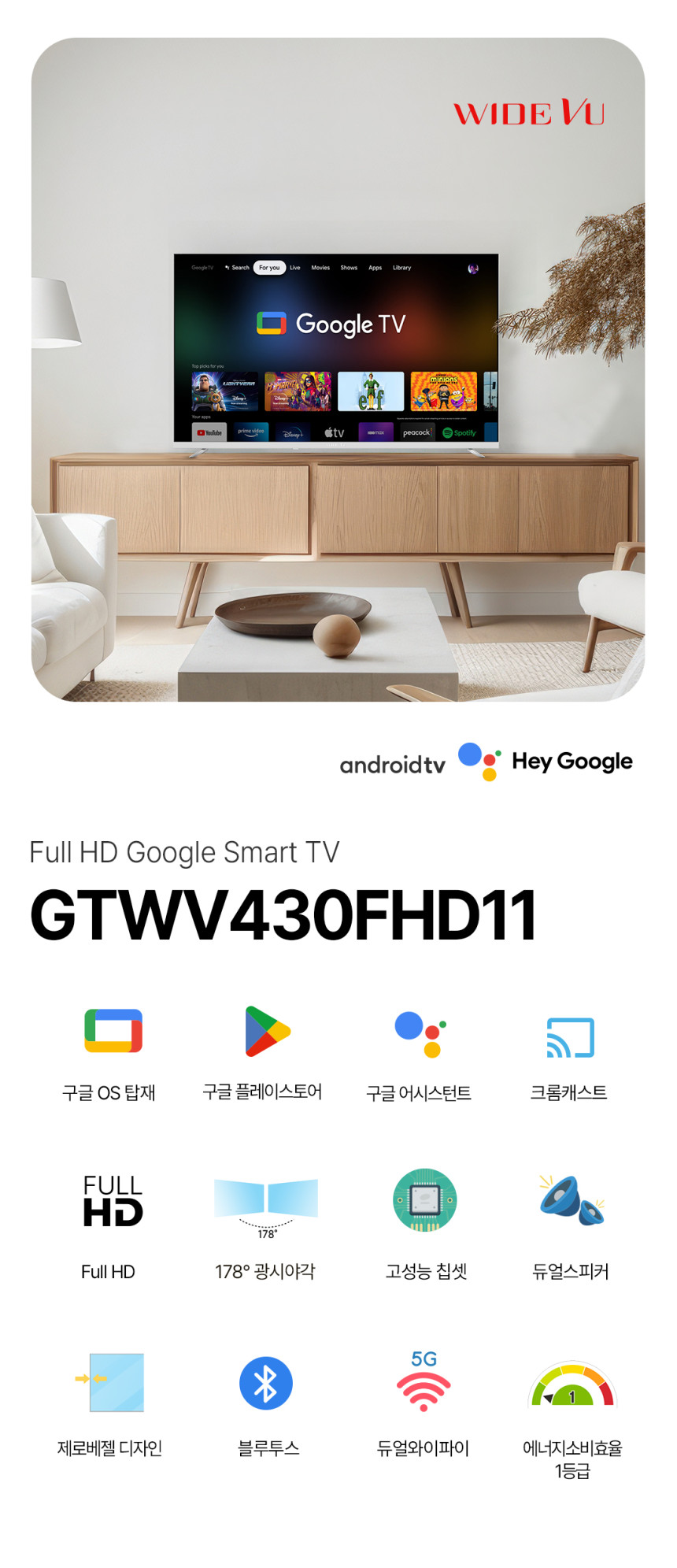 와이드뷰 109cm(43인치) FHD 화이트색상 구글 스마트 TV GTWV430FHD11 단품