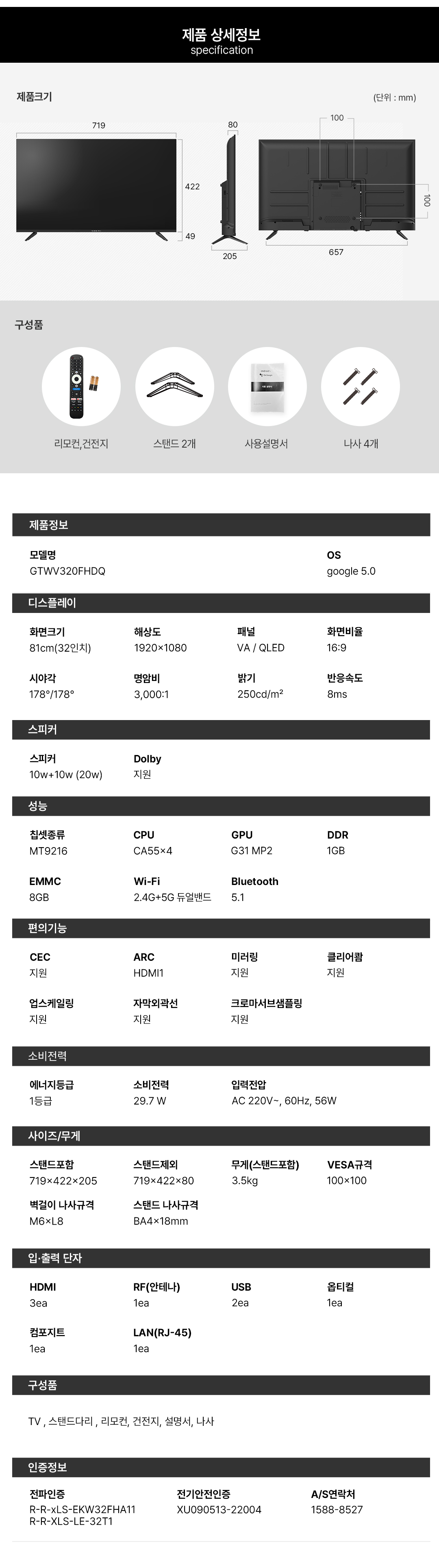 와이드뷰 QLED 81cm(32인치) FHD TV 블랙색상 구글 스마트 티비 GTWV320FHDQ 단품