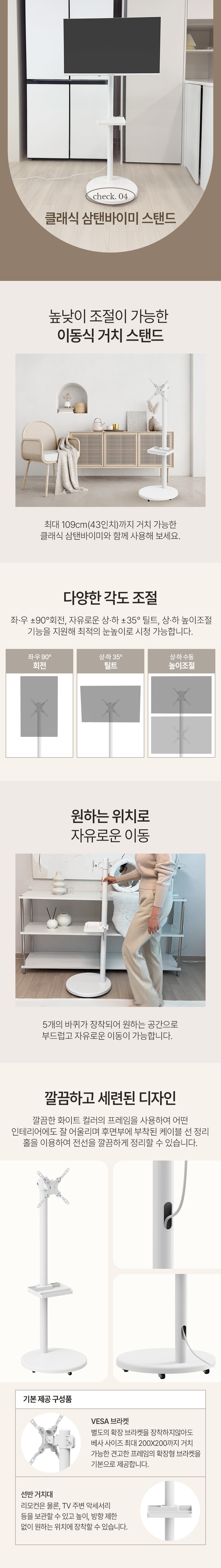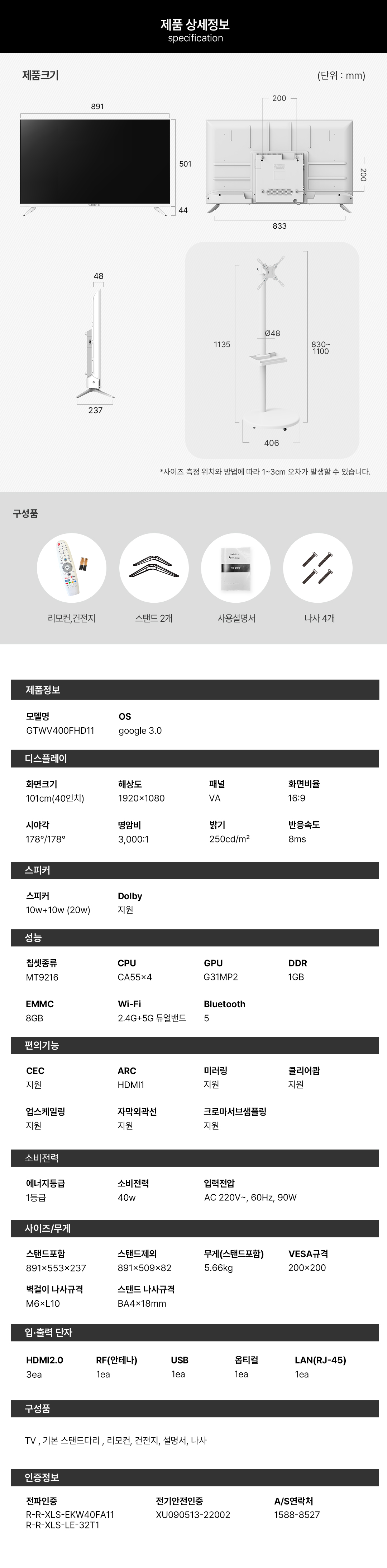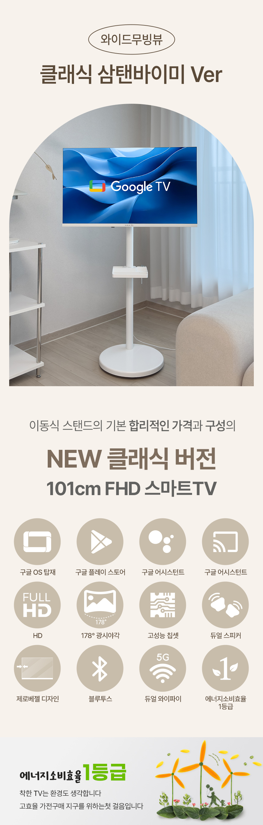 와이드무빙뷰 화이트에디션 101cm(40인치) 구글 FHD 스마트TV 클래식 이동식 스탠드 중소바이미 삼탠바이미