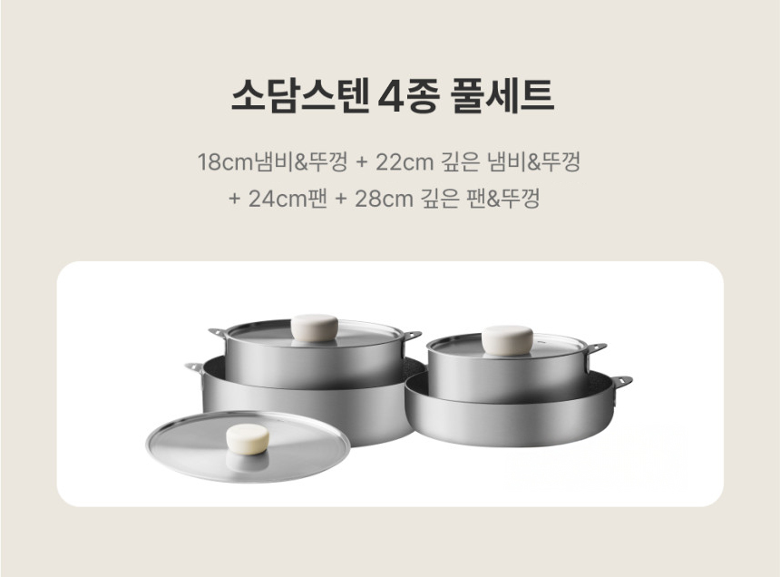 홈 주방용품 냄비/솥/찜기 냄비세트 리뷰 건 [모도리] 소담 스텐 쿡웨어 4종 + 멀티 핸들 세트 상품번호 B0709209 7,900원 삼성카드 7,900원 신한카드 5,000원 하나카드 1 / 7 할인가 199,000원 370,000원 최대혜택가 49% 187,120원 혜택 모두보기 적립 최대 e.POINT 적립 3,980P 자세히보기 배송비 무료배송 카드혜택 카드사별 무이자 혜택 > 팝업 닫기 재입고 알림을 신청 하시겠어요? 취소 재입고 알림 받기 팝업 닫기 재입고 알림이 신청 되었습니다. * 30일 후 자동 해제 * 마이랜드 재입고 알림 내역에서 확인 가능 확인 팝업 닫기 재입고 알림을 해제 하시겠어요? * 미입고시 2025-06-20 자동 해제 취소 지금 해제하기 팝업 닫기 재입고 알림이 해제 되었습니다. 확인 쿠폰받기 팝업 닫기 다운로드 받은 쿠폰은 마이랜드>쿠폰에서 확인가능합니다. 최소구매금액과 할인액을 확인하세요. 일부 쿠폰은 조기소진 될 수 있습니다. 쿠폰별 발급수량은 ID당 1개입니다. APP에서 구매하면 1% 추가 적립 본품 : 수량 감소 수량 증가 199,000원 총 상품금액 199,000원 생활파워케어 포함가 생활파손케어 포함가 구매하기 장바구니 할인 · 혜택 모두보기 팝업 닫기 정상가 370,000원 즉시할인 171,000원 할인가 199,000원 e.POINT 최대적립 i 창닫기 최대 적립 포인트는 할인가 기준으로 계산되며, 최종결제금액과 결제 조건에 따라 적립금액이 변경됩니다. 주문서에서 최종 적립혜택을 다시 한번 확인해주세요. 3,980P 기본적립 1,990P 앱 구매시 추가적립 추천 1,990P 카드혜택 삼성카드 캐시백(일반결제) 7,900원 신한카드 캐시백(일반결제) 7,900원 하나카드 즉시할인(일반결제) 5,000원 ※ 캐시백은 배송완료 기준 익익월 10일 이내 카드대금 결제통장으로 카드사에서 입금됩니다. 최대 혜택가 187,120원 삼성카드 캐시백 유의사항 삼성카드로 결제 시 4% 캐시백(최대 10만원 한도)최소 주문 금액 5만원 / 미충족시 캐시백 지급 불가 * 상품 상세페이지에서 혜택대상으로 표기된 일부 상품에만 혜택적용* 삼성카드 즉시할인 행사와 중복적용 가능* 체크카드, 법인카드, 기업카드(사업자 포함), 기프트카드(충전포함), 하이브리드 카드, bc카드로 결제 시 적용 제외* 스마일페이, Npay, 카카오페이, SSGPAY, 페이코, L.페이, 삼성페이, 토스, 차이페이, 무통장입금으로 결제 시 적용 제외* 최종카드결제금액 기준으로 캐시백 혜택이 적용(쿠폰, 포인트, e.POINT, OK캐시백 등을 차감한 금액)* 캐시백은 인도완료 기준으로 익익월 10일 내 지급 (캐시백 지급전 카드승인 취소, 카드사 탈회 시 지급되지 않음)* 기업회원, 비회원 주문건은 캐시백 대상에서 제외* 캐시백 행사는 당사 사정에 의하여 예고 없이 조기 종료될 수 있습니다. 신한카드 캐시백 유의사항 신한카드로 결제 시 4% 캐시백(최대 10만원 한도)최소 주문 금액 5만원 / 미충족시 캐시백 지급 불가 * 상품 상세페이지에서 혜택대상으로 표기된 일부 상품에만 혜택적용* 신한카드 즉시할인 행사와 중복적용 가능* 체크카드, 법인카드, 기업카드(사업자 포함), 기프트카드(충전포함), 하이브리드 카드, bc카드로 결제 시 적용 제외* 스마일페이, Npay, 카카오페이, SSGPAY, 페이코, L.페이, 삼성페이, 토스, 차이페이, 무통장입금으로 결제 시 적용 제외* 최종카드결제금액 기준으로 캐시백 혜택이 적용(쿠폰, 포인트, e.POINT, OK캐시백 등을 차감한 금액)* 캐시백은 인도완료 기준으로 익익월 10일 내 지급 (캐시백 지급전 카드승인 취소, 카드사 탈회 시 지급되지 않음)* 기업회원, 비회원 주문건은 캐시백 대상에서 제외* 캐시백 행사는 당사 사정에 의하여 예고 없이 조기 종료될 수 있습니다. 하나카드 즉시할인 유의사항 하나앱카드로 10만원 이상 결제 시 금액대별 즉시할인* 10만원 이상 결제 시 5천원 / 30만원 이상 1.5만원 / 50만원 이상 2.5만원 / 70만원 이상 3.5만원 / 100만원 이상 5만원 / 150만원이상 7.5만원 / 200만원 이상 10만원/ 250만원 이상 12.5만원 즉시할인* 적용제외대상: 법인/선불/기프트/하나BC 등 일부카드 및 간편결제수단, 전자랜드페이 결제건 제외* 비회원/기업회원 결제건 제외* 최종 카드결제금액 기준으로 혜택이 적용* 예산 소진 시 별도 공지없이 종료될 수 있음* 즉시할인이 적용된 실 결제금액은 카드사 승인금액으로 확인가능 * 주문취소 또는 부분취소로 인해 할인 조건에 부합하지 않을 경우, 적용된 할인금액은 환불금액에서 차감 e.POINT 적립 구매확정 시 자동 적립됩니다. 최종결제금액 및 결제조건에 따라 e.POINT 적립액은 달라질 수 있습니다. 쿠폰, 포인트, e.POINT 사용액은 최종결제금액에서 제외됩니다. 최종 적립액은 주문서에서 다시 한번 확인해 주세요. 사용기간은 적립일 기준 3년 후 말일까지입니다. 소멸일 이후 주문취소 시 복원되지 않습니다. 온라인쇼핑몰에서만 사용 가능한 포인트로 1P부터 사용 가능합니다. 카드 무이자 할부 팝업 닫기 1월 무이자 혜택안내 BC카드 5만원 이상 2,3,4,5 개월 무이자 할부 국민카드 5만원 이상 2,3 개월 무이자 할부 롯데카드 5만원 이상 2,3,4,5 개월 무이자 할부 전자랜드 롯데카드 5만원 이상 2,3,4,5 개월 무이자 할부 삼성카드 5만원 이상 2,3 개월 무이자 할부 신한카드 5만원 이상 2,3 개월 무이자 할부 