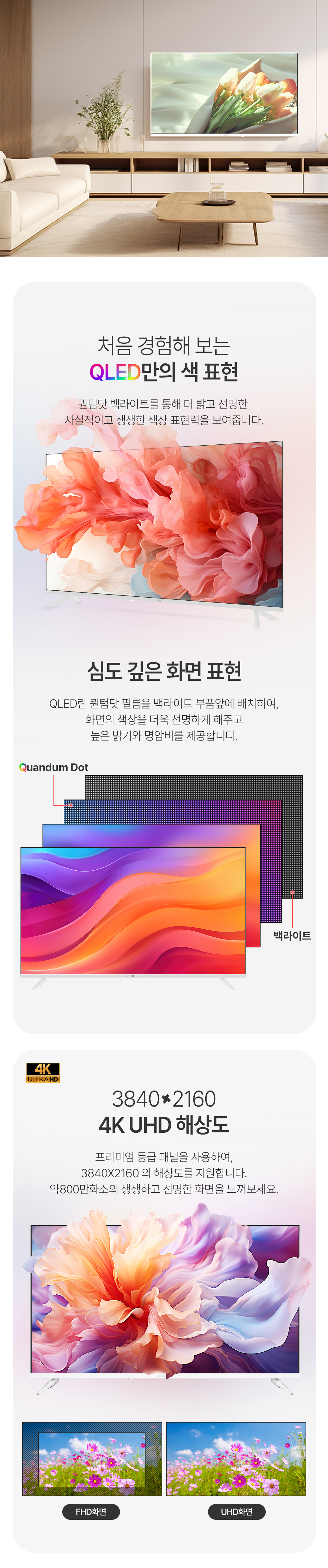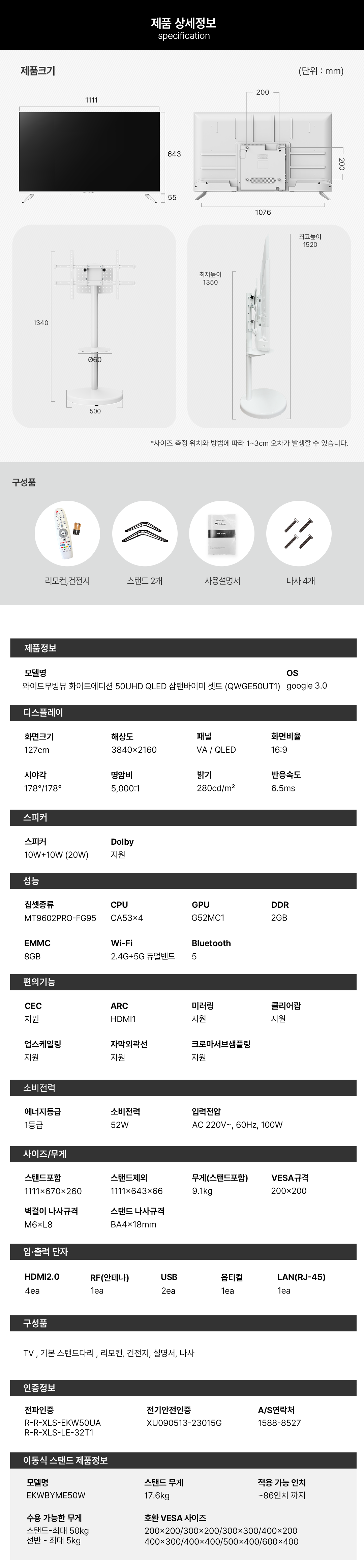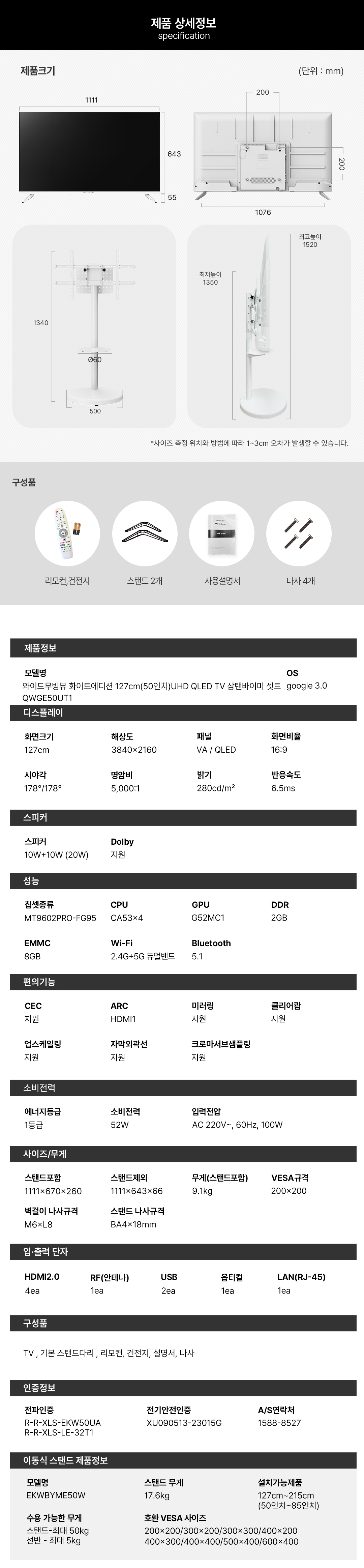 와이드무빙뷰 화이트에디션 127cm(50인치) 구글 UHD QLED 스마트TV 대형 이동식스탠드 삼탠바이미