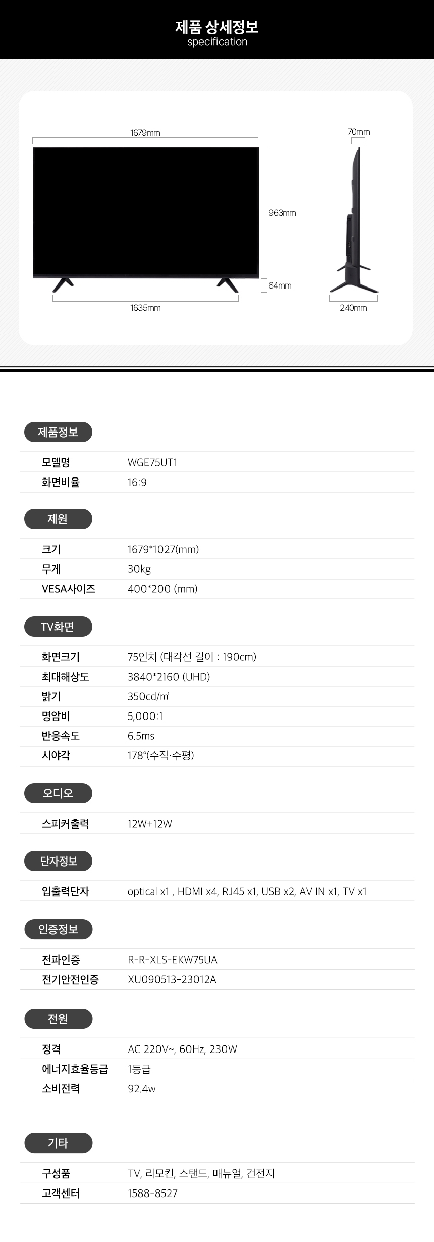 상품 구매 가이드에 모델명, 전기용품, 정격전압/소비전력, 제조사, 제조국, 크기/무게, 품질보증기준, A/S책임자와 전화번호, 전기안전인증, 에너지 소비효율로 구성된 표