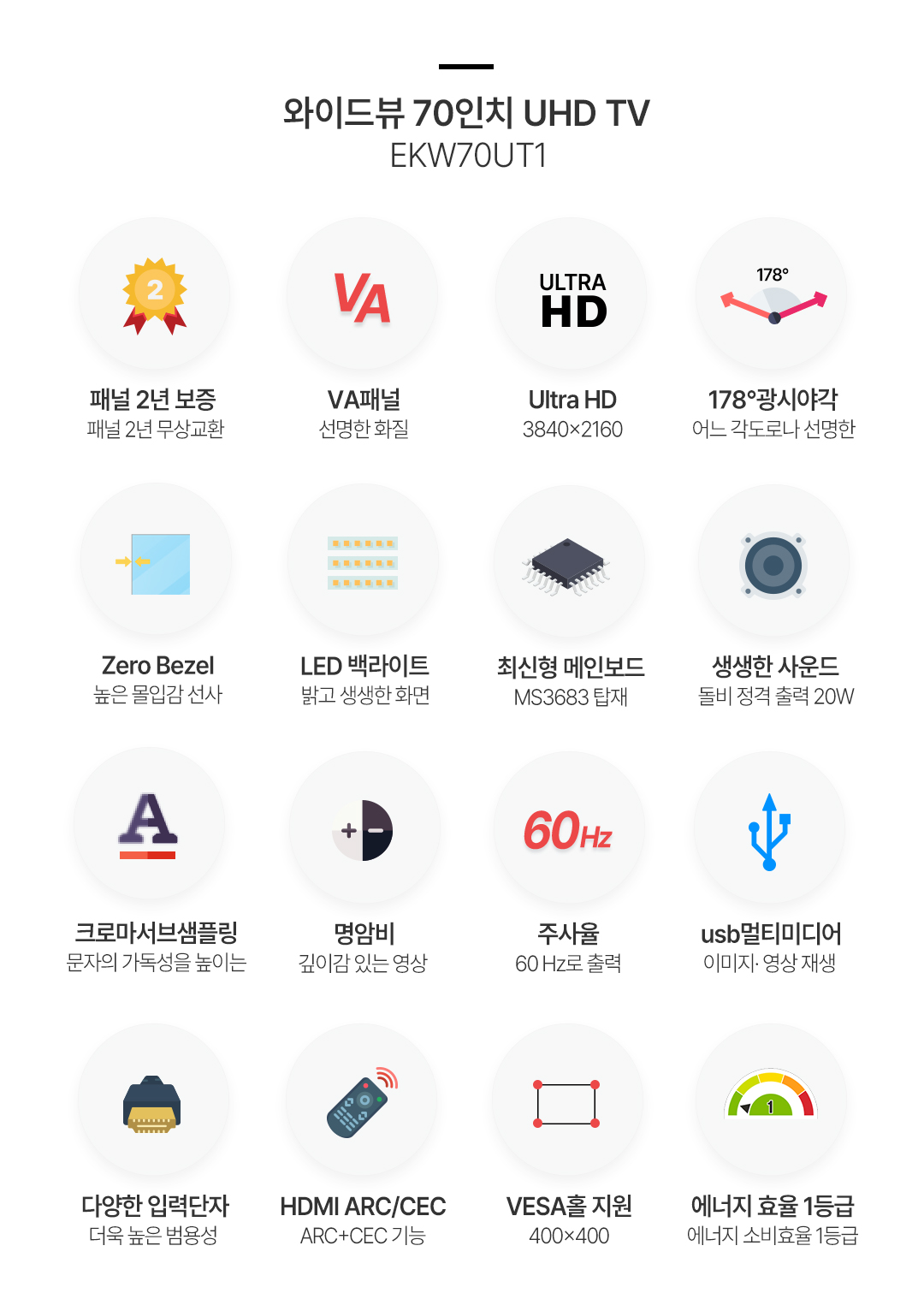 와이드뷰 177cm(70인치) UHD 4K 중소기업TV EKW70UT1 기사방문 스탠드 설치 무료