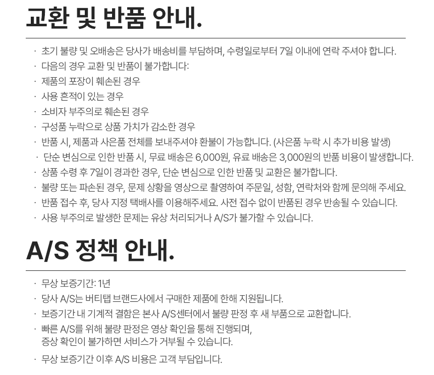 • ② 고객님의 단순변심으로 인한 교환/반품인 경우, 제품 수령 후 7일 이내에 신청해야 합니다.