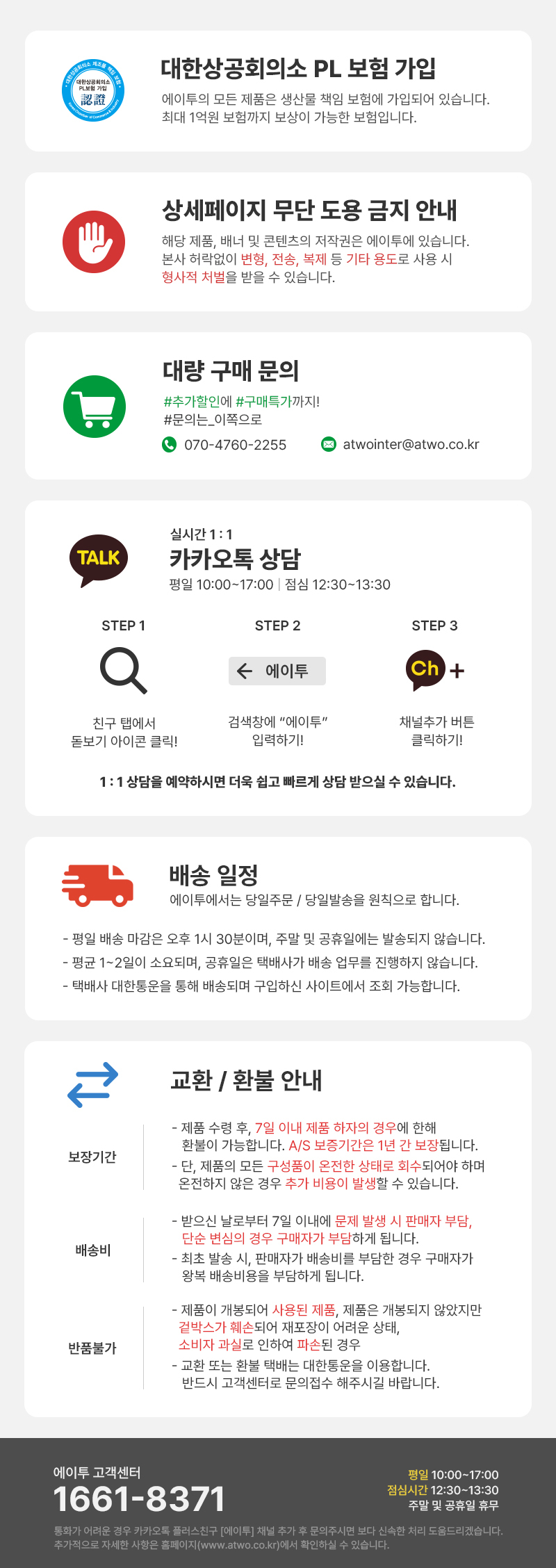 • - 제품 생산 지연, 주문 폭주, 천재지변 등의 사유로 인하여 배송기간이 길어질 수 있으며, 이러한 경우엔 별도 연락(휴대폰 문자)을 드립니다.(안심번호는 문자 발송 불가)