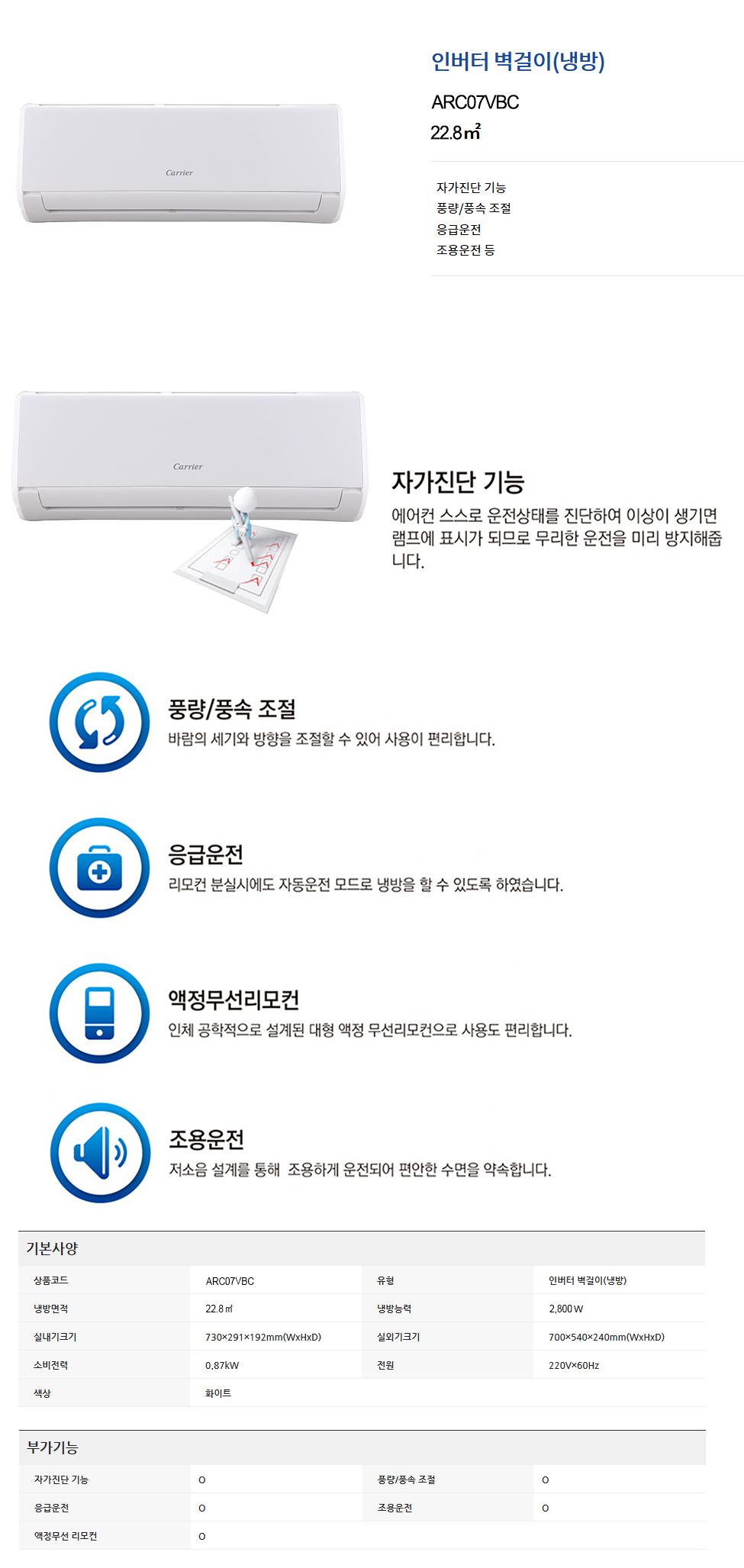 온라인 단독 리뷰 건 [캐리어/ARC07VBC] (지역한정)벽걸이에어컨 /인버터 7평형/기본설치비무료 상품번호 S0621415 서울/경기/강원 일부만 가능 그외 불가 19,100원 삼성카드 19,100원 신한카드 15,000원 하나카드 1 / 1 할인가 478,000원 769,000원 최대혜택가 42% 449,340원 혜택 모두보기 적립 최대 e.POINT 적립 9,560P 자세히보기 배송비 무료배송 카드혜택 카드사별 무이자 혜택 > 팝업 닫기 재입고 알림을 신청 하시겠어요? 취소 재입고 알림 받기 팝업 닫기 재입고 알림이 신청 되었습니다. * 30일 후 자동 해제 * 마이랜드 재입고 알림 내역에서 확인 가능 확인 팝업 닫기 재입고 알림을 해제 하시겠어요? * 미입고시 2025-06-20 자동 해제 취소 지금 해제하기 팝업 닫기 재입고 알림이 해제 되었습니다. 확인 쿠폰받기 팝업 닫기 다운로드 받은 쿠폰은 마이랜드>쿠폰에서 확인가능합니다. 최소구매금액과 할인액을 확인하세요. 일부 쿠폰은 조기소진 될 수 있습니다. 쿠폰별 발급수량은 ID당 1개입니다. APP에서 구매하면 1% 추가 적립 본품 : 수량 감소 수량 증가 478,000원 총 상품금액 478,000원 생활파워케어 포함가 생활파손케어 포함가 SOLD OUT 재입고 알림 신청 할인 · 혜택 모두보기 팝업 닫기 정상가 769,000원 즉시할인 291,000원 할인가 478,000원 e.POINT 최대적립 i 창닫기 최대 적립 포인트는 할인가 기준으로 계산되며, 최종결제금액과 결제 조건에 따라 적립금액이 변경됩니다. 주문서에서 최종 적립혜택을 다시 한번 확인해주세요. 9,560P 기본적립 4,780P 앱 구매시 추가적립 추천 4,780P 카드혜택 삼성카드 캐시백(일반결제) 19,100원 신한카드 캐시백(일반결제) 19,100원 하나카드 즉시할인(일반결제) 15,000원 ※ 캐시백은 배송완료 기준 익익월 10일 이내 카드대금 결제통장으로 카드사에서 입금됩니다. 최대 혜택가 449,340원 삼성카드 캐시백 유의사항 삼성카드로 결제 시 4% 캐시백(최대 10만원 한도)최소 주문 금액 5만원 / 미충족시 캐시백 지급 불가 * 상품 상세페이지에서 혜택대상으로 표기된 일부 상품에만 혜택적용* 삼성카드 즉시할인 행사와 중복적용 가능* 체크카드, 법인카드, 기업카드(사업자 포함), 기프트카드(충전포함), 하이브리드 카드, bc카드로 결제 시 적용 제외* 스마일페이, Npay, 카카오페이, SSGPAY, 페이코, L.페이, 삼성페이, 토스, 차이페이, 무통장입금으로 결제 시 적용 제외* 최종카드결제금액 기준으로 캐시백 혜택이 적용(쿠폰, 포인트, e.POINT, OK캐시백 등을 차감한 금액)* 캐시백은 인도완료 기준으로 익익월 10일 내 지급 (캐시백 지급전 카드승인 취소, 카드사 탈회 시 지급되지 않음)* 기업회원, 비회원 주문건은 캐시백 대상에서 제외* 캐시백 행사는 당사 사정에 의하여 예고 없이 조기 종료될 수 있습니다. 신한카드 캐시백 유의사항 신한카드로 결제 시 4% 캐시백(최대 10만원 한도)최소 주문 금액 5만원 / 미충족시 캐시백 지급 불가 * 상품 상세페이지에서 혜택대상으로 표기된 일부 상품에만 혜택적용* 신한카드 즉시할인 행사와 중복적용 가능* 체크카드, 법인카드, 기업카드(사업자 포함), 기프트카드(충전포함), 하이브리드 카드, bc카드로 결제 시 적용 제외* 스마일페이, Npay, 카카오페이, SSGPAY, 페이코, L.페이, 삼성페이, 토스, 차이페이, 무통장입금으로 결제 시 적용 제외* 최종카드결제금액 기준으로 캐시백 혜택이 적용(쿠폰, 포인트, e.POINT, OK캐시백 등을 차감한 금액)* 캐시백은 인도완료 기준으로 익익월 10일 내 지급 (캐시백 지급전 카드승인 취소, 카드사 탈회 시 지급되지 않음)* 기업회원, 비회원 주문건은 캐시백 대상에서 제외* 캐시백 행사는 당사 사정에 의하여 예고 없이 조기 종료될 수 있습니다. 하나카드 즉시할인 유의사항 하나앱카드로 10만원 이상 결제 시 금액대별 즉시할인* 10만원 이상 결제 시 5천원 / 30만원 이상 1.5만원 / 50만원 이상 2.5만원 / 70만원 이상 3.5만원 / 100만원 이상 5만원 / 150만원이상 7.5만원 / 200만원 이상 10만원/ 250만원 이상 12.5만원 즉시할인* 적용제외대상: 법인/선불/기프트/하나BC 등 일부카드 및 간편결제수단, 전자랜드페이 결제건 제외* 비회원/기업회원 결제건 제외* 최종 카드결제금액 기준으로 혜택이 적용* 예산 소진 시 별도 공지없이 종료될 수 있음* 즉시할인이 적용된 실 결제금액은 카드사 승인금액으로 확인가능 * 주문취소 또는 부분취소로 인해 할인 조건에 부합하지 않을 경우, 적용된 할인금액은 환불금액에서 차감 e.POINT 적립 구매확정 시 자동 적립됩니다. 최종결제금액 및 결제조건에 따라 e.POINT 적립액은 달라질 수 있습니다. 쿠폰, 포인트, e.POINT 사용액은 최종결제금액에서 제외됩니다. 최종 적립액은 주문서에서 다시 한번 확인해 주세요. 사용기간은 적립일 기준 3년 후 말일까지입니다. 소멸일 이후 주문취소 시 복원되지 않습니다. 온라인쇼핑몰에서만 사용 가능한 포인트로 1P부터 사용 가능합니다. 카드 무이자 할부 팝업 닫기 1월 무이자 혜택안내 BC카드 5만원 이상 2,3,4,5 개월 무이자 할부 국민카드 5만원 이상 2,3 개월 무이자 할부 롯데카드 5만원 이상 2,3,4,5 개월 무이자 할부 전자랜드 롯데카드 5만원 이상 2,3,4,5 개월 무이자 할부 삼성카드 5만원 이상 2,3 개월 무이