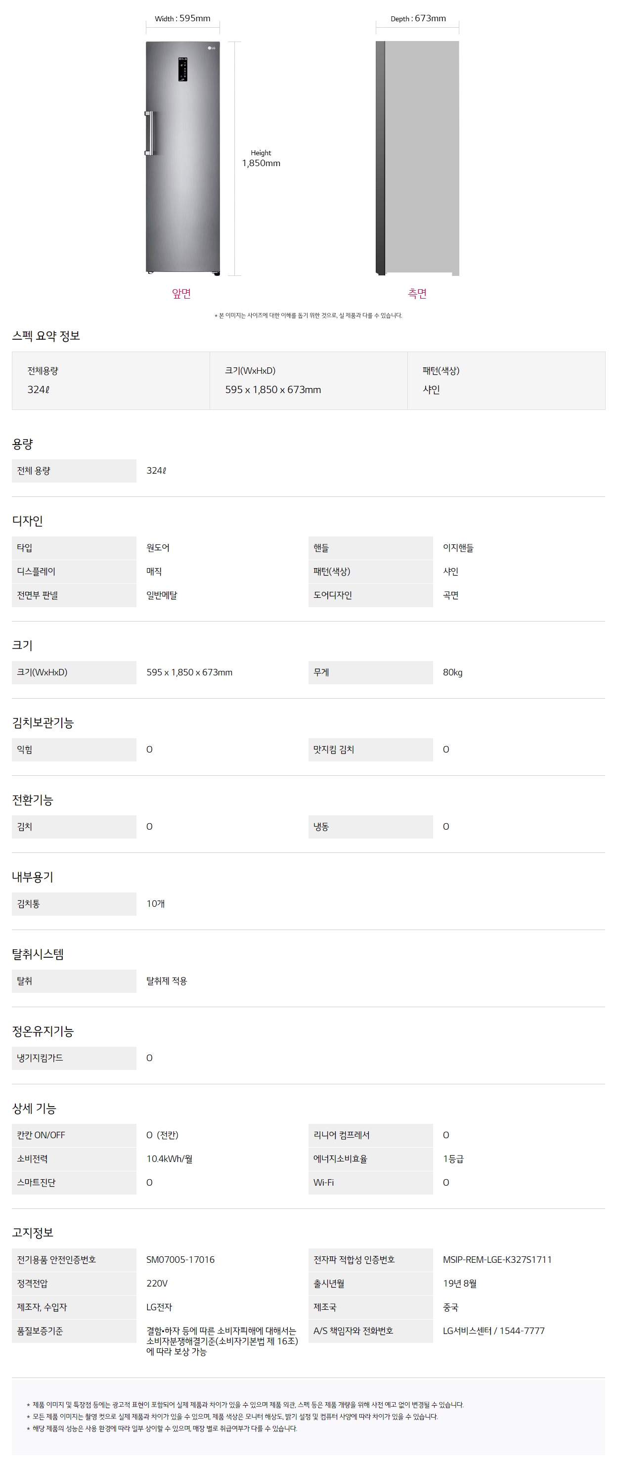 온라인 단독 [LG전자/K328SE] (마지막재고한정)김치냉장고_스탠드 324L / 샤인 / 전국무료배송/폐가전수거 상품번호 S0957394 50,500원 삼성카드 50,500원 신한카드 50,000원 하나카드 1 / 1 할인가 1,010,000원 1,587,000원 최대혜택가 41% 939,300원 혜택 모두보기 적립 최대 e.POINT 적립 20,200P 자세히보기 배송비 무료배송 카드혜택 카드사별 무이자 혜택 > 팝업 닫기 재입고 알림을 신청 하시겠어요? 취소 재입고 알림 받기 팝업 닫기 재입고 알림이 신청 되었습니다. * 30일 후 자동 해제 * 마이랜드 재입고 알림 내역에서 확인 가능 확인 팝업 닫기 재입고 알림을 해제 하시겠어요? * 미입고시 2025-06-20 자동 해제 취소 지금 해제하기 팝업 닫기 재입고 알림이 해제 되었습니다. 확인 쿠폰받기 팝업 닫기 다운로드 받은 쿠폰은 마이랜드>쿠폰에서 확인가능합니다. 최소구매금액과 할인액을 확인하세요. 일부 쿠폰은 조기소진 될 수 있습니다. 쿠폰별 발급수량은 ID당 1개입니다. APP에서 구매하면 1% 추가 적립 본품 : 수량 감소 수량 증가 1,010,000원 총 상품금액 1,010,000원 생활파워케어 포함가 생활파손케어 포함가 SOLD OUT 재입고 알림 신청 할인 · 혜택 모두보기 팝업 닫기 정상가 1,587,000원 즉시할인 577,000원 할인가 1,010,000원 e.POINT 최대적립 i 창닫기 최대 적립 포인트는 할인가 기준으로 계산되며, 최종결제금액과 결제 조건에 따라 적립금액이 변경됩니다. 주문서에서 최종 적립혜택을 다시 한번 확인해주세요. 20,200P 기본적립 10,100P 앱 구매시 추가적립 추천 10,100P 카드혜택 삼성카드 캐시백(일반결제) 50,500원 신한카드 캐시백(일반결제) 50,500원 하나카드 즉시할인(일반결제) 50,000원 ※ 캐시백은 결제일 기준 익익월 10일 이내 고객님의 카드대금 결제통장으로 카드사에서 입금됩니다. 최대 혜택가 939,300원 삼성카드 캐시백 유의사항 삼성카드로 결제 시 5% 캐시백(최대 20만원 한도) 최소 주문 금액 5만원 / 미충족시 캐시백 지급 불가 ? * 상품 상세페이지에서 혜택대상으로 표기된 일부 상품에만 혜택적용 * 삼성카드 즉시할인 행사와 중복적용 가능 * 체크카드, 법인카드, 기업카드(사업자 포함), 기프트카드(충전포함), 하이브리드 카드, bc카드로 결제 시 적용 제외 * 스마일페이, Npay, 카카오페이, SSGPAY, 페이코, L.페이, 삼성페이, 토스, 차이페이, 무통장입금으로 결제 시 적용 제외 * 최종카드결제금액 기준으로 캐시백 혜택이 적용(쿠폰, 포인트, e.POINT, OK캐시백 등을 차감한 금액) * 캐시백은 결제일 기준 익익월 10일 내 지급(캐시백 지급전 카드승인 취소, 카드사 탈회 시 지급되지 않음) * 기업회원, 비회원 주문건은 캐시백 대상에서 제외 * 캐시백 행사는 당사 사정에 의하여 예고 없이 조기 종료될 수 있습니다.? 신한카드 캐시백 유의사항 신한카드로 결제 시 5% 캐시백(최대 20만원 한도) 최소 주문 금액 5만원 / 미충족시 캐시백 지급 불가 * 상품 상세페이지에서 혜택대상으로 표기된 일부 상품에만 혜택적용 * 신한카드 즉시할인 행사와 중복적용 가능 * 체크카드, 법인카드, 기업카드(사업자 포함), 기프트카드(충전포함), 하이브리드 카드, bc카드로 결제 시 적용 제외 * 스마일페이, Npay, 카카오페이, SSGPAY, 페이코, L.페이, 삼성페이, 토스, 차이페이, 무통장입금으로 결제 시 적용 제외 * 최종카드결제금액 기준으로 캐시백 혜택이 적용(쿠폰, 포인트, e.POINT, OK캐시백 등을 차감한 금액) * 캐시백은 결제일 기준 익익월 10일 내 지급(캐시백 지급전 카드승인 취소, 카드사 탈회 시 지급되지 않음) * 기업회원, 비회원 주문건은 캐시백 대상에서 제외 * 캐시백 행사는 당사 사정에 의하여 예고 없이 조기 종료될 수 있습니다. * 하나카드 즉시할인 유의사항 하나앱카드로 10만원 이상 결제 시 금액대별 즉시할인* 10만원 이상 결제 시 5천원 / 30만원 이상 1.5만원 / 50만원 이상 2.5만원 / 70만원 이상 3.5만원 / 100만원 이상 5만원 / 150만원이상 7.5만원 / 200만원 이상 10만원/ 250만원 이상 12.5만원 즉시할인* 적용제외대상: 법인/선불/기프트/하나BC 등 일부카드 및 간편결제수단, 전자랜드페이 결제건 제외* 비회원/기업회원 결제건 제외* 최종 카드결제금액 기준으로 혜택이 적용* 예산 소진 시 별도 공지없이 종료될 수 있음* 즉시할인이 적용된 실 결제금액은 카드사 승인금액으로 확인가능 * 주문취소 또는 부분취소로 인해 할인 조건에 부합하지 않을 경우, 적용된 할인금액은 환불금액에서 차감 e.POINT 적립 구매확정 시 자동 적립됩니다. 최종결제금액 및 결제조건에 따라 e.POINT 적립액은 달라질 수 있습니다. 쿠폰, 포인트, e.POINT 사용액은 최종결제금액에서 제외됩니다. 최종 적립액은 주문서에서 다시 한번 확인해 주세요. 사용기간은 적립일 기준 3년 후 말일까지입니다. 소멸일 이후 주문취소 시 복원되지 않습니다. 온라인쇼핑몰에서만 사용 가능한 포인트로 1P부터 사용 가능합니다. 카드 무이자 할부 팝업 닫기 12월 무이자 혜택안내 BC카드 5만원 이상 2,3,4,5 개월 무이자 할부 국민카드 5만원 이상 2,3,4,5 개월 무이자 할부 롯데카드 5만원 이상 2,3,4,5 개월 무이자 할부 전자랜드 롯데카드 5만원 이상 2,3,4,5 개월 무이자 할부 삼성카드 5만원 이상 2,3 개월 무이자 할부