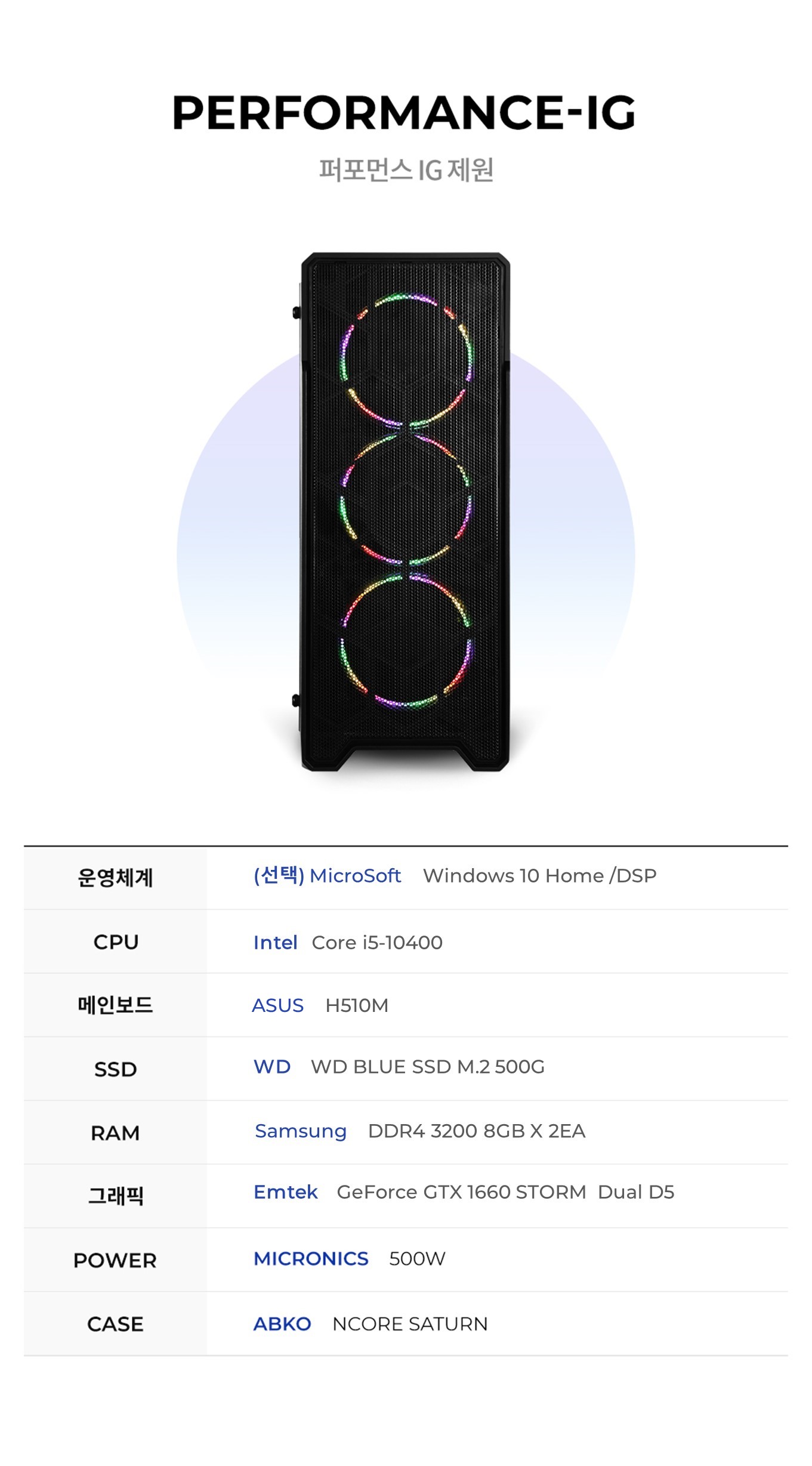 [순정PC/PERPORMANCE-IG-L] [순정pc/전자랜드] M-G 조립PC 조립 컴퓨터 / 순수정품 인텔i5 ASUS-H510M Emtek GTX 1660 윈도우10