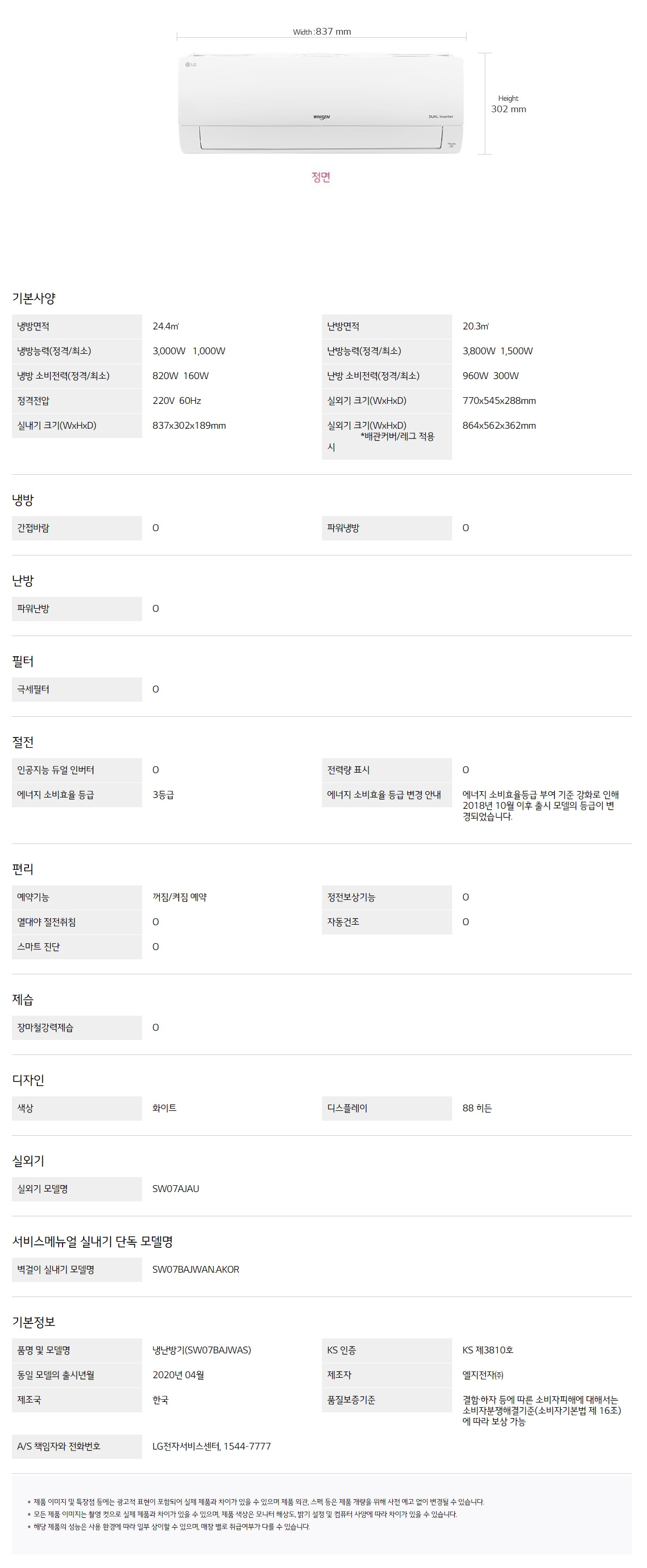 [LG전자/SW07BAJWAS] [렌탈] 벽걸이냉난방_07형 화이트 전국무료배송/기본설치무료