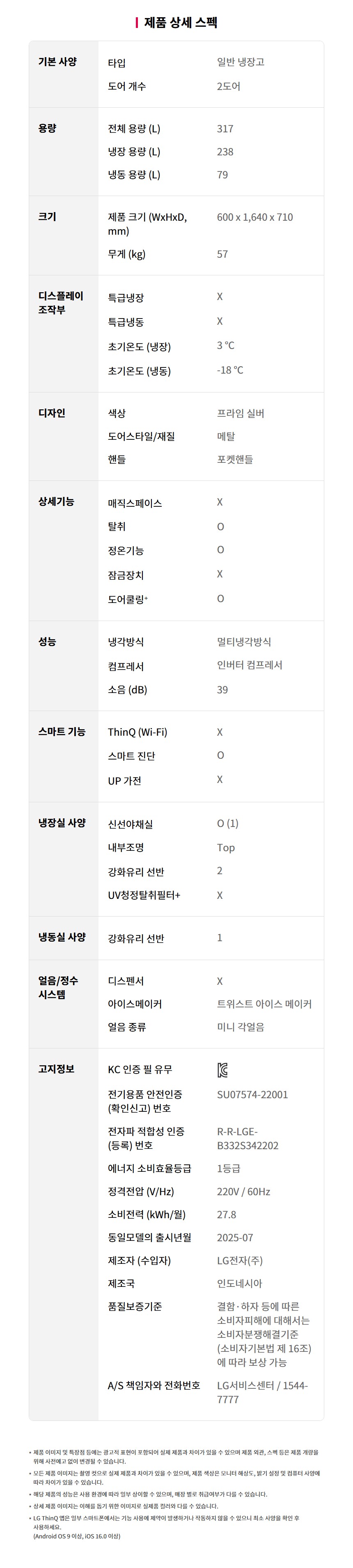 홈 냉장고/주방가전 냉장고/냉동고 냉장고/냉동고 일반형 냉장고 [LG전자/D315MPS31] 일반냉장고 오브제컬렉션 1등급 317L LG물류 직배송 무료배송 설치 상품번호 S6294572 35,000원 하나카드 22,500 쿠폰할인 e.POINT 적립 7,275P 사은품 1 / 2 관련 기획전 할인가 727,500원 990,000원 최대혜택가 31% 685,225원 혜택 모두보기 > 배송비 무료배송 카드혜택 카드사별 무이자 혜택 > 팝업 닫기 재입고 알림을 신청 하시겠어요? 취소 재입고 알림 받기 팝업 닫기 재입고 알림이 신청 되었습니다. * 30일 후 자동 해제 * 마이랜드 재입고 알림 내역에서 확인 가능 확인 팝업 닫기 재입고 알림을 해제 하시겠어요? * 미입고시 2025-06-20 자동 해제 취소 지금 해제하기 팝업 닫기 재입고 알림이 해제 되었습니다. 확인 쿠폰받기 팝업 닫기 다운로드 받은 쿠폰은 마이랜드>쿠폰에서 확인가능합니다. 최소구매금액과 할인액을 확인하세요. 일부 쿠폰은 조기소진 될 수 있습니다. 쿠폰별 발급수량은 ID당 1개입니다. APP에서 구매하면 1% 추가 적립 본품 : 수량 감소 수량 증가 727,500원 총 상품금액 727,500원 생활파워케어 포함가 생활파손케어 포함가 구매하기 선물하기 장바구니 할인 · 혜택 모두보기 팝업 닫기 정상가 990,000원 즉시할인 240,000원 쿠폰할인 3% 할인 쿠폰 22,500원 할인가 727,500원 e.POINT 적립 기본적립 7,275P 7,275P 카드혜택 하나카드 즉시할인(일반결제) 35,000원 최대 혜택가 685,225원 하나카드 즉시할인 유의사항 하나앱카드로 10만원 이상 결제 시 금액대별 즉시할인* 10만원 이상 결제 시 5천원 / 30만원 이상 1.5만원 / 50만원 이상 2.5만원 / 70만원 이상 3.5만원 / 100만원 이상 5만원 / 150만원이상 7.5만원 / 200만원 이상 10만원/ 250만원 이상 12.5만원 즉시할인* 적용제외대상: 법인/선불/기프트/하나BC 등 일부카드 및 간편결제수단, 전자랜드페이 결제건 제외* 비회원/기업회원 결제건 제외* 최종 카드결제금액 기준으로 혜택이 적용* 예산 소진 시 별도 공지없이 종료될 수 있음* 즉시할인이 적용된 실 결제금액은 카드사 승인금액으로 확인가능 * 주문취소 또는 부분취소로 인해 할인 조건에 부합하지 않을 경우, 적용된 할인금액은 환불금액에서 차감 e.POINT 적립 적립금액기준 - 기본적립: 최종결제금액의 1% - APP적립: 최종결제금액의 1% - 행사/ 상품적립: 조건에 따라 변동 구매확정 후 자동 적립되며 일부 상품에 대해 적립이 제외될 수 있습니다. 사용기간은 적립일 기준 3년 후 말일까지입니다. 소멸일 이후 주문취소 시 복원되지 않습니다. 온라인쇼핑몰에서만 사용 가능한 포인트로 1P부터 사용 가능합니다. 최종결제 금액에 따라 적립되는 e.POINT가 변동 될 수 있습니다. 쿠폰, 포인트, e.POINT 등 할인 금액은 최종결제금액에서 제외됩니다. 카드 무이자 할부 팝업 닫기 10월 무이자 혜택안내 BC카드 5만원 이상 2,3,4,5 개월 무이자 할부 국민카드 5만원 이상 2,3,4,5 개월 무이자 할부 롯데카드 5만원 이상 2,3,4,5 개월 무이자 할부 전자랜드 롯데카드 5만원 이상 2,3,4,5 개월 무이자 할부 삼성카드 5만원 이상 2,3,4,5 개월 무이자 할부 신한카드 5만원 이상 2,3,4,5 개월 무이자 할부 외환카드 5만원 이상 2,3,4,5 개월 무이자 할부 현대카드 5만원 이상 2,3 개월 무이자 할부 하나카드 5만원 이상 2,3,4 개월 무이자 할부 농협카드 5만원 이상 2,3,4,5,6 개월 무이자 할부 전자랜드 스페셜 롯데카드 5만원 이상 2,3,4,5 개월 무이자 할부 우리카드 5만원 이상 2,3,4,5 개월 무이자 할부 10월 부분무이자 / 특별무이자 혜택안내 BC카드 5만원 이상 10,12개월 부분무이자 할부 10개월 부분무이자 (1~4회차 이자 고객부담) 12개월 부분무이자 (1~5회차 이자 고객부담) 국민카드 5만원 이상 6,10개월 부분무이자 할부 6개월 부분무이자 (1~3회차 이자 고객부담) 10개월 부분무이자 (1~5회차 이자 고객부담) 삼성카드 5만원 이상 7,11개월 부분무이자 할부 7개월 부분무이자 (1~3회차 이자 고객부담) 11개월 부분무이자 (1~5회차 이자 고객부담) 신한카드 5만원 이상 7,9,11개월 부분무이자 할부 7개월 부분무이자 (1~3회차 이자 고객부담) 9개월 부분무이자 (1~4회차 이자 고객부담) 11개월 부분무이자 (1~5회차 이자 고객부담) 현대카드 5만원 이상 10,12개월 부분무이자 할부 10개월 부분무이자 (1~5회차 이자 고객부담) 12개월 부분무이자 (1~6회차 이자 고객부담) 하나카드 5만원 이상 6,10,12개월 부분무이자 할부 6개월 부분무이자 (1~3회차 이자 고객부담) 10개월 부분무이자 (1~4회차 이자 고객부담) 12개월 부분무이자 (1~5회차 이자 고객부담) 농협카드 5만원 이상 7,8,9,10,12,24개월 부분무이자 할부 7개월 부분무이자 (1~3회차 이자 고객부담) 8개월 부분무이자 (1~3회차 이자 고객부담) 9개월 부분무이자 (1~3회차 이자 고객부담) 10개월 부분무이자 (1~3회차 이자 고객부담) 12개월 부분무이자 (1~4회차 이자 고객부담) 24개월 부분무이자 (1~6회차 이자 고객부담) 전북은행카드 5만원 이상 4,5,6,7,8,9,10,11,12개월 부분무이자 할부 4개월 부분무이자 (1회차 이자 고객부담) 5개월 부분무이자 (1회차 이자 고객부담) 6개월 부분무이자 (1회차 이자 고객부담) 7개월 부분무이자 (1회차 이자 고객부담) 8개월 부분무이자 (1회차 이자 고객부담) 9개월 부분무이자