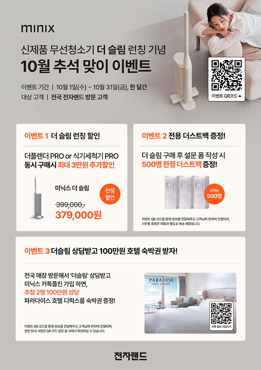 홈 세탁기/생활가전 청소기 핸디/스틱청소기 온라인 단독 미닉스 무선청소기 더 슬림 MNVC-100G 상품번호 S6294654 15,000원 하나카드 e.POINT 적립 3,980P 1 / 8 관련 기획전 할인가 398,000원 499,000원 최대혜택가 24% 379,020원 혜택 모두보기 > 배송비 무료배송 카드혜택 카드사별 무이자 혜택 > 팝업 닫기 재입고 알림을 신청 하시겠어요? 취소 재입고 알림 받기 팝업 닫기 재입고 알림이 신청 되었습니다. * 30일 후 자동 해제 * 마이랜드 재입고 알림 내역에서 확인 가능 확인 팝업 닫기 재입고 알림을 해제 하시겠어요? * 미입고시 2025-06-20 자동 해제 취소 지금 해제하기 팝업 닫기 재입고 알림이 해제 되었습니다. 확인 쿠폰받기 팝업 닫기 다운로드 받은 쿠폰은 마이랜드>쿠폰에서 확인가능합니다. 최소구매금액과 할인액을 확인하세요. 일부 쿠폰은 조기소진 될 수 있습니다. 쿠폰별 발급수량은 ID당 1개입니다. APP에서 구매하면 1% 추가 적립 본품 : 수량 감소 수량 증가 398,000원 총 상품금액 398,000원 생활파워케어 포함가 생활파손케어 포함가 구매하기 장바구니 할인 · 혜택 모두보기 팝업 닫기 정상가 499,000원 즉시할인 101,000원 할인가 398,000원 e.POINT 적립 기본적립 3,980P 3,980P 카드혜택 하나카드 즉시할인(일반결제) 15,000원 최대 혜택가 379,020원 하나카드 즉시할인 유의사항 하나앱카드로 10만원 이상 결제 시 금액대별 즉시할인* 10만원 이상 결제 시 5천원 / 30만원 이상 1.5만원 / 50만원 이상 2.5만원 / 70만원 이상 3.5만원 / 100만원 이상 5만원 / 150만원이상 7.5만원 / 200만원 이상 10만원/ 250만원 이상 12.5만원 즉시할인* 적용제외대상: 법인/선불/기프트/하나BC 등 일부카드 및 간편결제수단, 전자랜드페이 결제건 제외* 비회원/기업회원 결제건 제외* 최종 카드결제금액 기준으로 혜택이 적용* 예산 소진 시 별도 공지없이 종료될 수 있음* 즉시할인이 적용된 실 결제금액은 카드사 승인금액으로 확인가능 * 주문취소 또는 부분취소로 인해 할인 조건에 부합하지 않을 경우, 적용된 할인금액은 환불금액에서 차감 e.POINT 적립 적립금액기준 - 기본적립: 최종결제금액의 1% - APP적립: 최종결제금액의 1% - 행사/ 상품적립: 조건에 따라 변동 구매확정 후 자동 적립되며 일부 상품에 대해 적립이 제외될 수 있습니다. 사용기간은 적립일 기준 3년 후 말일까지입니다. 소멸일 이후 주문취소 시 복원되지 않습니다. 온라인쇼핑몰에서만 사용 가능한 포인트로 1P부터 사용 가능합니다. 최종결제 금액에 따라 적립되는 e.POINT가 변동 될 수 있습니다. 쿠폰, 포인트, e.POINT 등 할인 금액은 최종결제금액에서 제외됩니다. 카드 무이자 할부 팝업 닫기 10월 무이자 혜택안내 BC카드 5만원 이상 2,3,4,5 개월 무이자 할부 국민카드 5만원 이상 2,3,4,5 개월 무이자 할부 롯데카드 5만원 이상 2,3,4,5 개월 무이자 할부 전자랜드 롯데카드 5만원 이상 2,3,4,5 개월 무이자 할부 삼성카드 5만원 이상 2,3,4,5 개월 무이자 할부 신한카드 5만원 이상 2,3,4,5 개월 무이자 할부 외환카드 5만원 이상 2,3,4,5 개월 무이자 할부 현대카드 5만원 이상 2,3 개월 무이자 할부 하나카드 5만원 이상 2,3,4 개월 무이자 할부 농협카드 5만원 이상 2,3,4,5,6 개월 무이자 할부 전자랜드 스페셜 롯데카드 5만원 이상 2,3,4,5 개월 무이자 할부 우리카드 5만원 이상 2,3,4,5 개월 무이자 할부 10월 부분무이자 / 특별무이자 혜택안내 BC카드 5만원 이상 10,12개월 부분무이자 할부 10개월 부분무이자 (1~4회차 이자 고객부담) 12개월 부분무이자 (1~5회차 이자 고객부담) 국민카드 5만원 이상 6,10개월 부분무이자 할부 6개월 부분무이자 (1~3회차 이자 고객부담) 10개월 부분무이자 (1~5회차 이자 고객부담) 삼성카드 5만원 이상 7,11개월 부분무이자 할부 7개월 부분무이자 (1~3회차 이자 고객부담) 11개월 부분무이자 (1~5회차 이자 고객부담) 신한카드 5만원 이상 7,9,11개월 부분무이자 할부 7개월 부분무이자 (1~3회차 이자 고객부담) 9개월 부분무이자 (1~4회차 이자 고객부담) 11개월 부분무이자 (1~5회차 이자 고객부담) 현대카드 5만원 이상 10,12개월 부분무이자 할부 10개월 부분무이자 (1~5회차 이자 고객부담) 12개월 부분무이자 (1~6회차 이자 고객부담) 하나카드 5만원 이상 6,10,12개월 부분무이자 할부 6개월 부분무이자 (1~3회차 이자 고객부담) 10개월 부분무이자 (1~4회차 이자 고객부담) 12개월 부분무이자 (1~5회차 이자 고객부담) 농협카드 5만원 이상 7,8,9,10,12,24개월 부분무이자 할부 7개월 부분무이자 (1~3회차 이자 고객부담) 8개월 부분무이자 (1~3회차 이자 고객부담) 9개월 부분무이자 (1~3회차 이자 고객부담) 10개월 부분무이자 (1~3회차 이자 고객부담) 12개월 부분무이자 (1~4회차 이자 고객부담) 24개월 부분무이자 (1~6회차 이자 고객부담) 전북은행카드 5만원 이상 4,5,6,7,8,9,10,11,12개월 부분무이자 할부 4개월 부분무이자 (1회차 이자 고객부담) 5개월 부분무이자 (1회차 이자 고객부담) 6개월 부분무이자 (1회차 이자 고객부담) 7개월 부분무이자 (1회차 이자 고객부담) 8개월 부분무이자 (1회차 이자 고객부담) 9개월 부분무이자 (1회차 이자 고객부담) 10개월 부분무이자 (1~2회차 이자 고객부담) 11개월 부분무이자 (1~2회차 이자 고객부담) 12개월 
