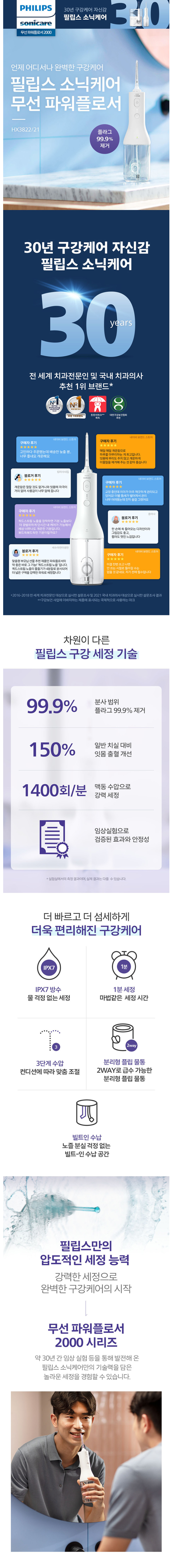필립스 소닉케어 무선 구강세정기 2000 화이트 HX3822/21