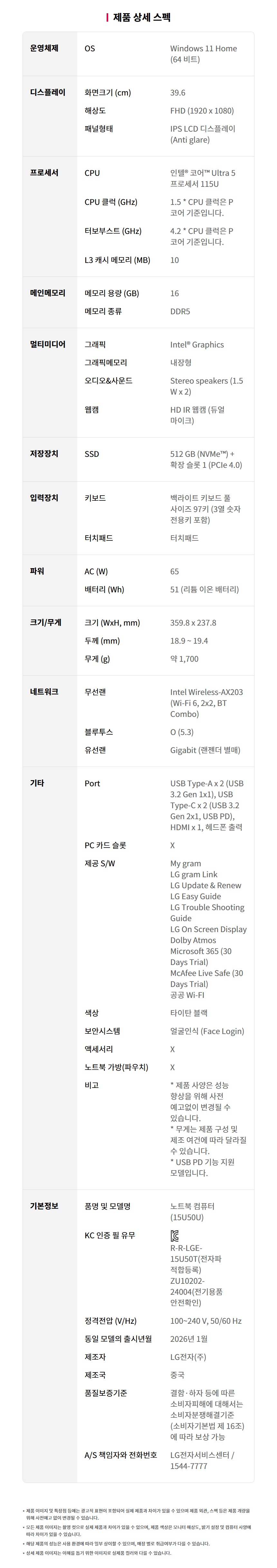 [신모델] LG그램북 26년형 39.6cm(15인치) 타이탄 블랙 울트라5 16/512G 15U50U-G.AA5VK