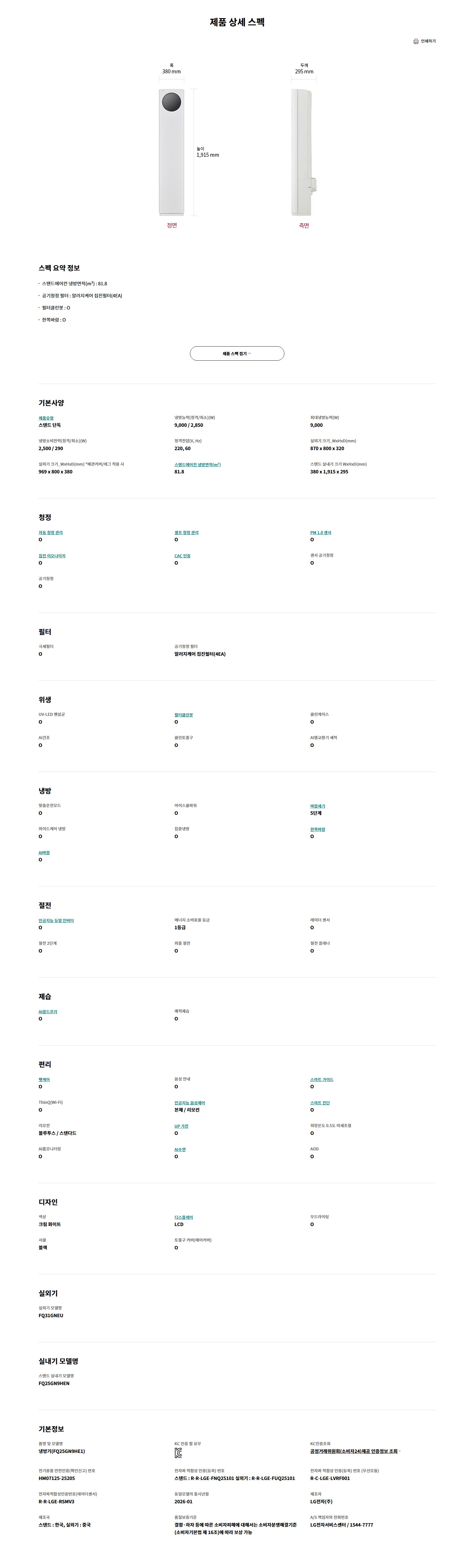 LG 휘센 AI 타워I 에어컨 싱글 9시리즈 FQ25GN9HE1 일반배관 전국무료배송/기본설치비 포함/실외기 포함