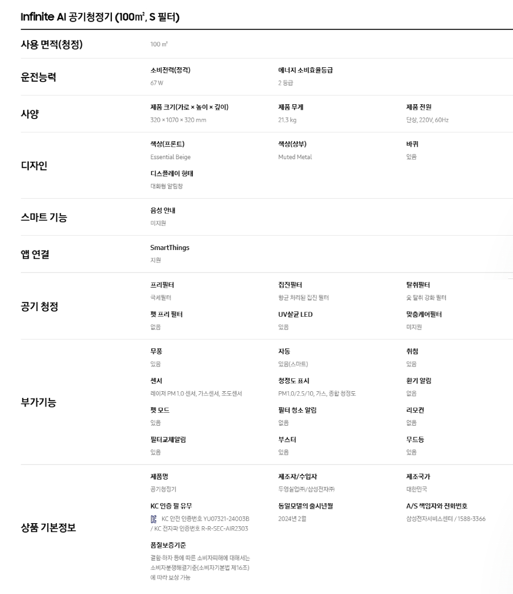삼성 Infinite AI 공기청정기 AP90H10163EDD