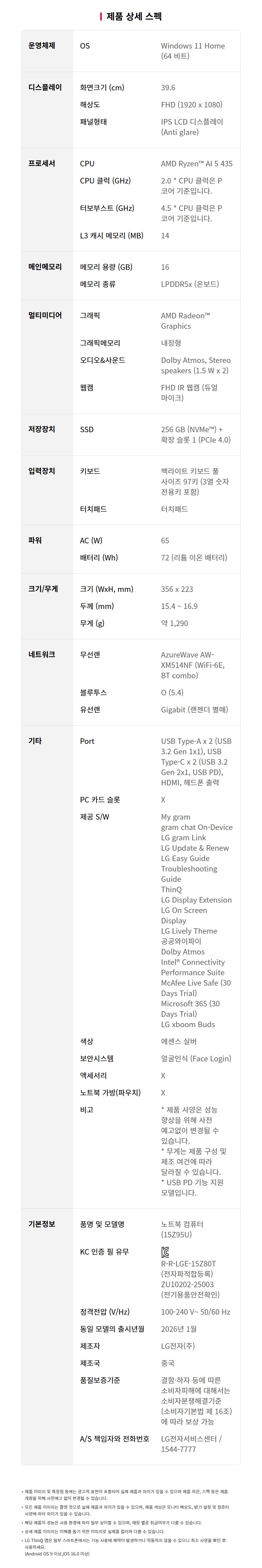 LG그램 26년형 15인치 AMD 512G 윈11포함 15Z95U-G.AS5DK